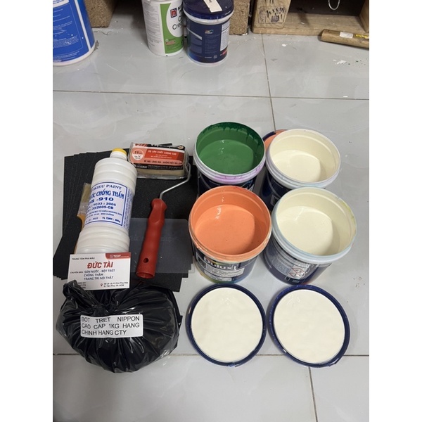 Nhà cửa & Đời sống > Dụng cụ & Thiết bị tiện ích > Sơn & chất chống thấm tường || Combo( 4kg Sơn pha màu Trắng kem.Cam Hồng .xanh đậm phối màu trong nhà hàng cao cấp bột trét giấy nhám )Còn hàng