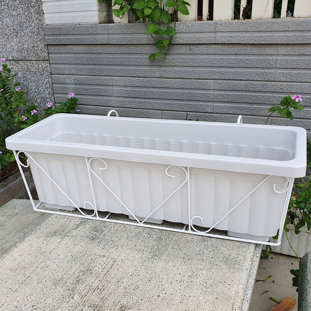 Bộ kệ treo ban công và chậu nhựa trồng rau màu trắng gồm chậu nhựa thông minh trắng, đi kèm với khung sắt sơn tĩnh điện màu trắng, giúp cho ngôi nhà của bạn thêm tươi sáng và mát mắt.Cao 19 cm x Dài 63.5 cm x Rộng 22 cm