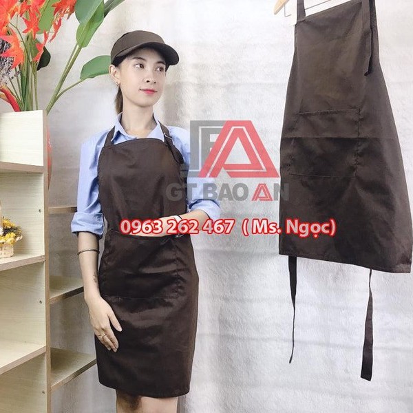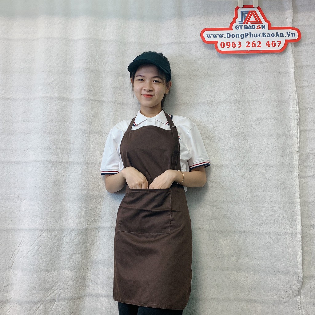 o Tạp dề dài dạng yếm, đeo cổ, có dây cột phía sau, 1 túi phía trước đựng sổ order hoặc các vật dụng hỗ trợ cần thiết. Các đường may kỹ lưỡng, đảm bảo độ bền cao