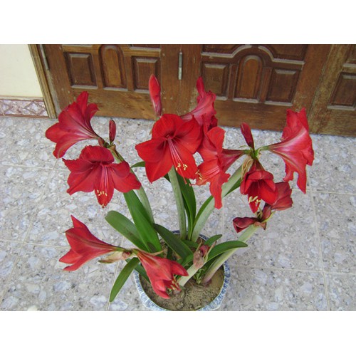 Chú ý: củ lan huệ size cỡ trứng vịt.Huệ đỏ là cây thân giả (giống hành tây). Lá hình giải hẹp, thuôn nhọn, mọc đối nhau thành hai hàng xanh đậm. Cọng hoa tròn to, mọc lên từ nách lá có thể cao đến 20-30cm. Thường mỗi cành hoa có 4 nụ, từ khi nở đến khi tàn khoảng 5-10 ngày, lúc đầu nở 2 hoa vài ngày sau nở tiếp hai hoa còn lại.
