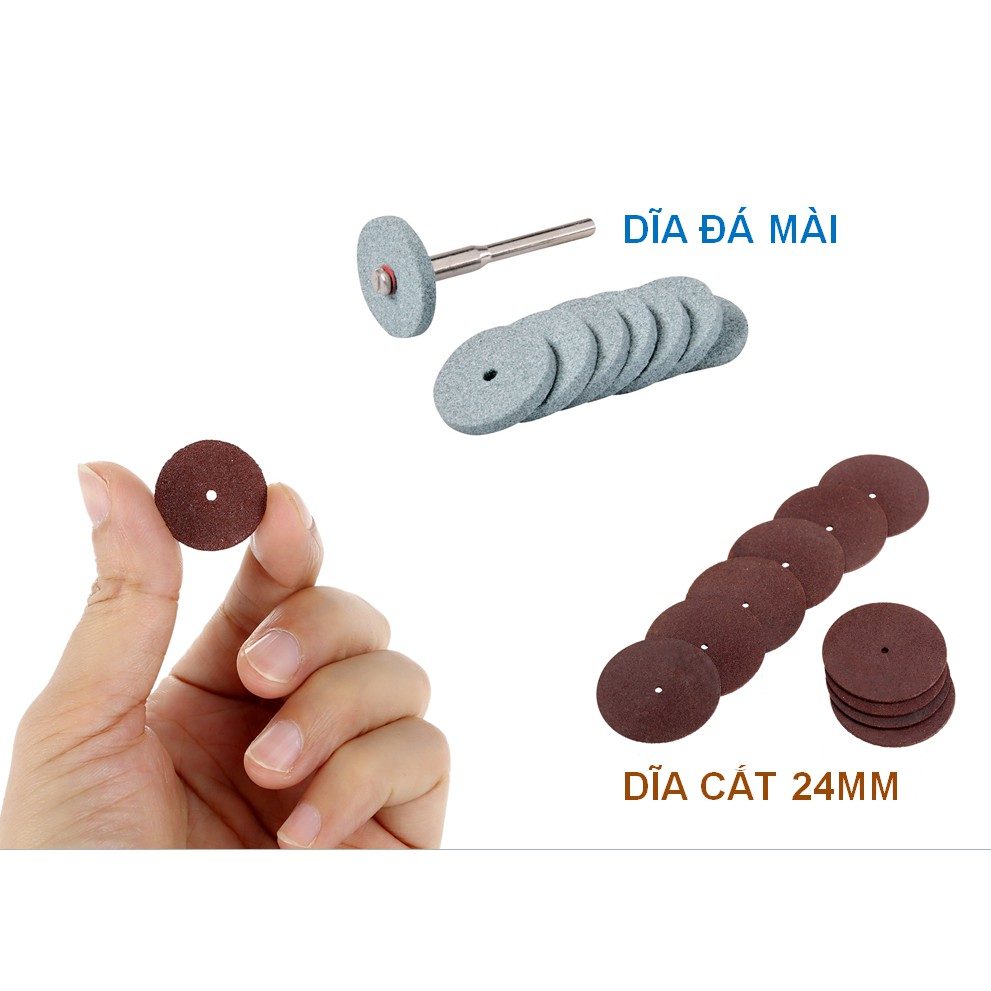 Combo gồm 5 dĩa cắt hoăc 5 dĩa đá mài + 1 trục nối 2.3mmKích thước dĩa cắt: đường kính 24mm độ dày 0.2mm