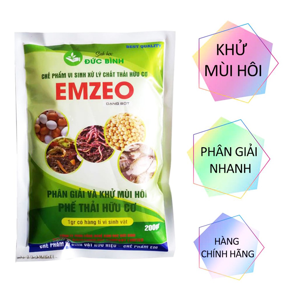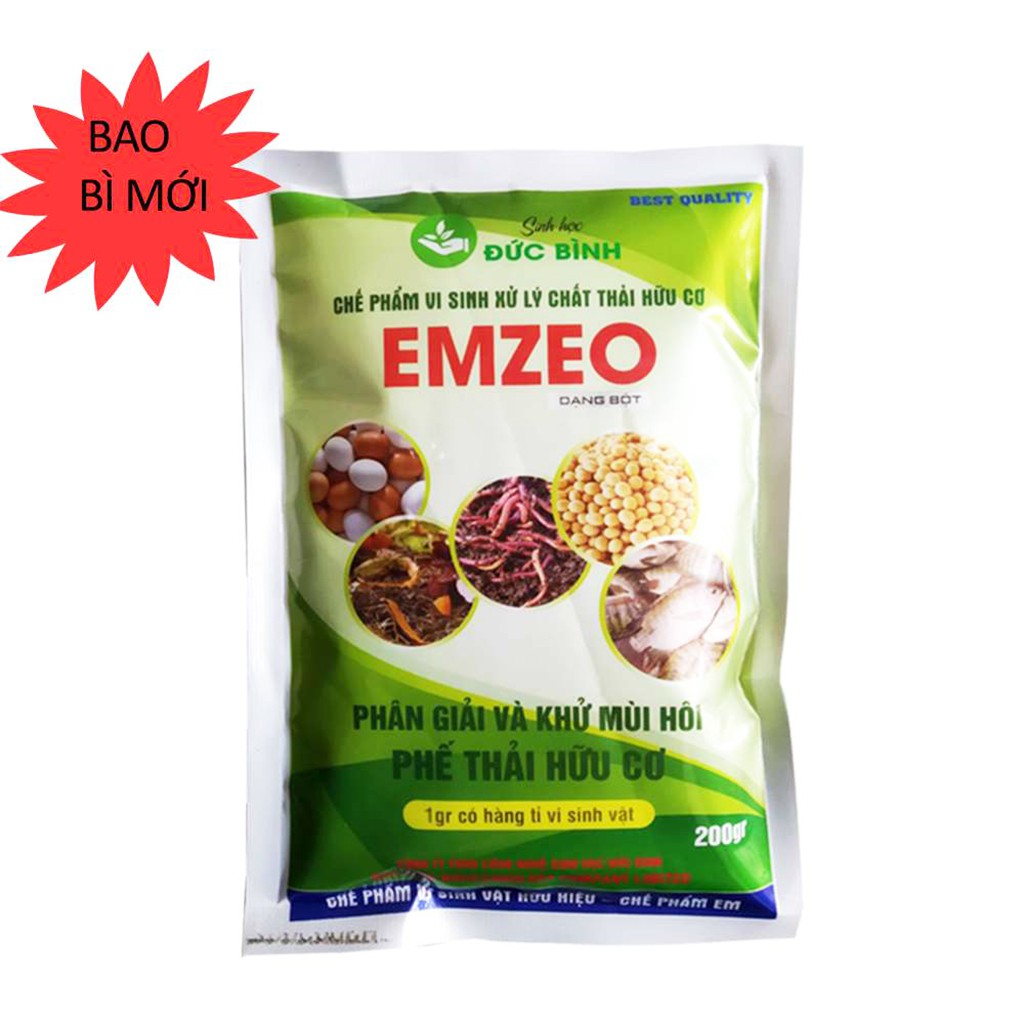 Emzeo là chế phẩm sinh học hay còn gọi là men vi sinh, chứa hàng tỉ bào tử vi sinh vật có lợi bao gồm: Bacillus, Saccharomyces, lactobacillus, actinomyces,.. có hiệu lực cao. Emzeo có khả năng hấp thụ và khử mùi hôi trong quá trình ủ phân bón và ủ đậu tương cực tốt. Bên cạnh đó, emzeo còn dùng để chuyên ủ đậu tương, phân bón, rác thải sinh hoạt gia đình và nước thải