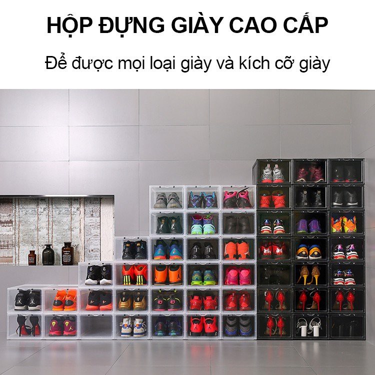 Hộp giày trong suốt có nắp đóng mở nên bạn dễ dàng thấy được những đôi giày trong hộp và giúp bạn dễ dàng khi lấy ra dùng.
