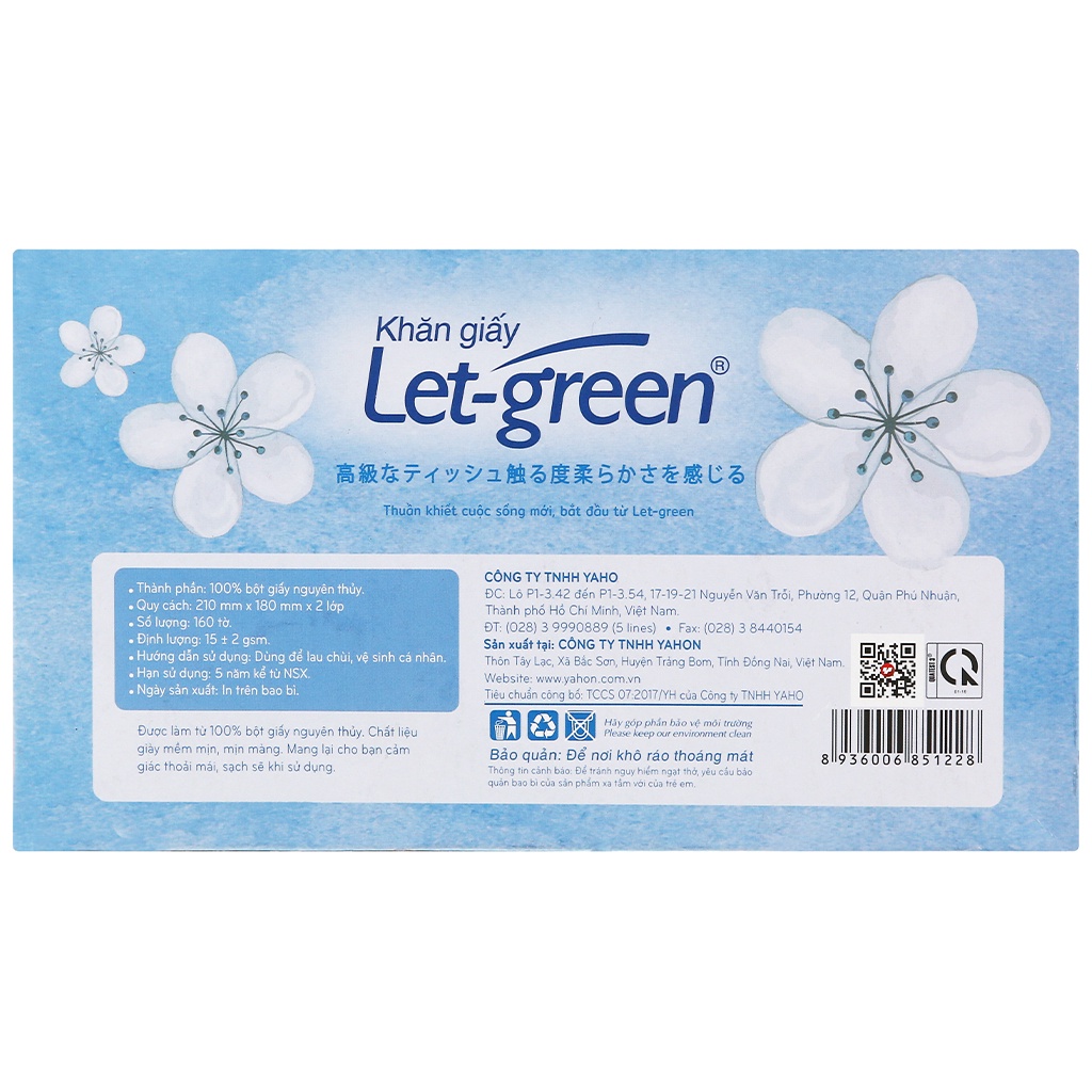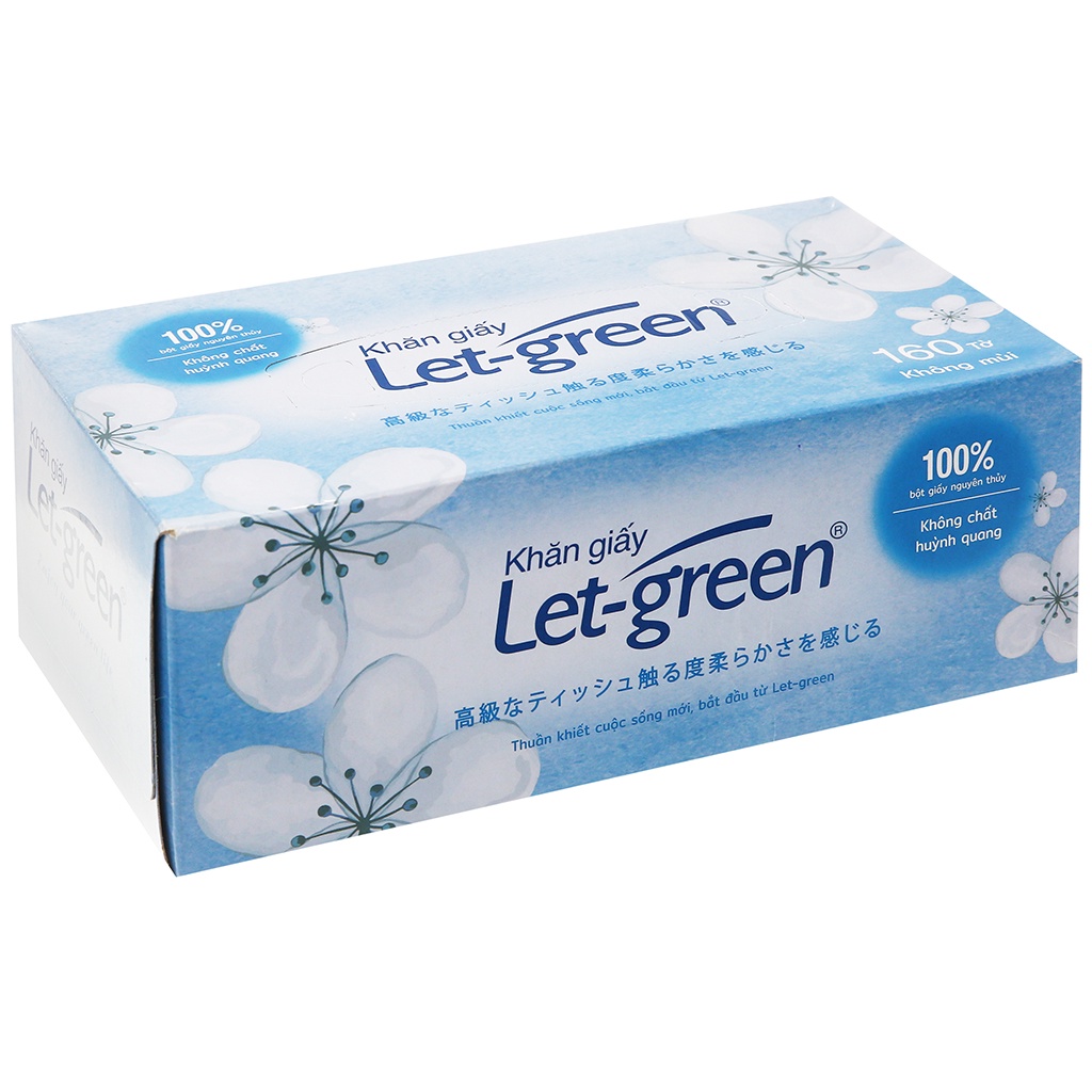 Khăn giấy hộp Let-green 160 tờ/hộpKhăn giấy hộp Let-green 160 tờ được sản xuất từ nguyên liệu 100% bột giấy nguyên chất, thân thiện và an toàn với người sử dụng.