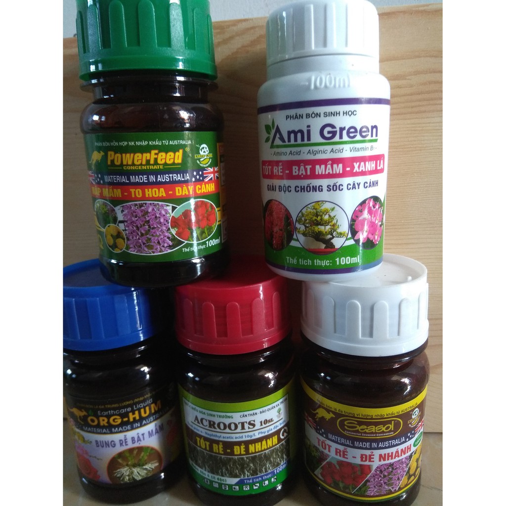 Combo 5 loại phân bón dành cho hoa lan (Org hum+acroots+power feed+seasol+Ami green) - chai 100ml