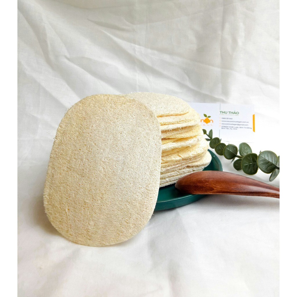 + Miếng xơ mướp khô thành phần 100% xơ mướp tự nhiên được được ép mỏng
