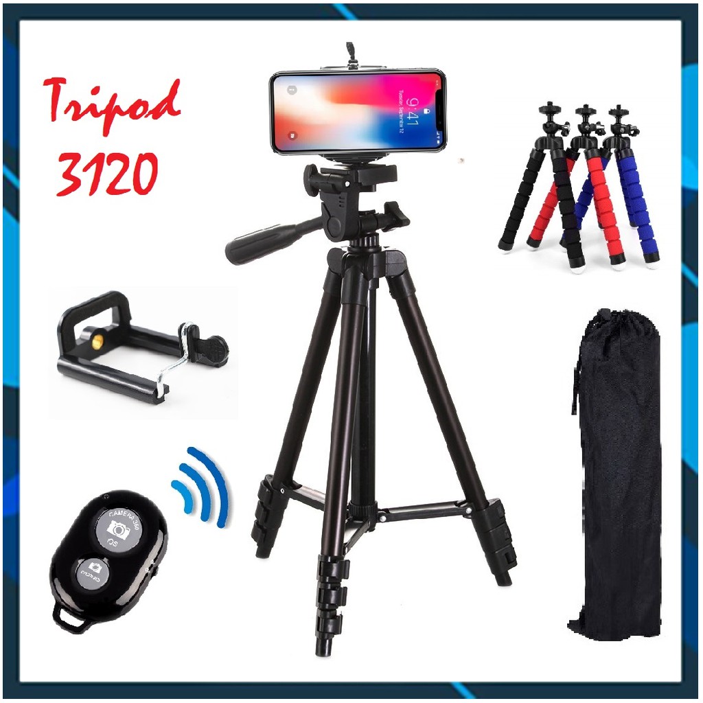 Combo 5 món Tripod 3120 THẾ HỆ MỚI + Gá kẹp 001 + REMOTE Bluetooth + Chân đế bạch tuột + Túi đựng Tripod