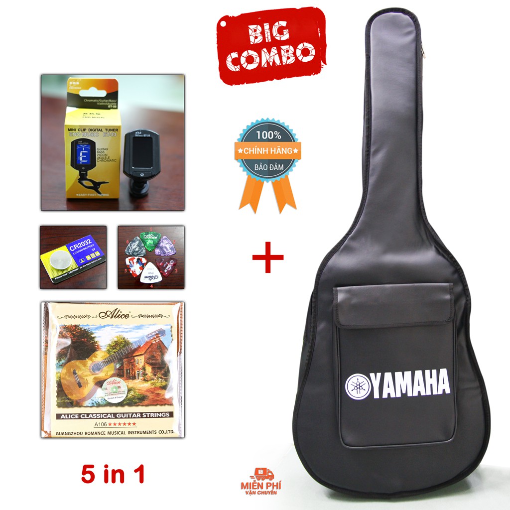 Combo 5 phụ kiện đàn Guitar : Bao da 3 lớp Yamaha + Máy lên dây ET-33 + Dây đàn Alice A106 + 1 Pin CR2032 + 1 Phím Gãy
