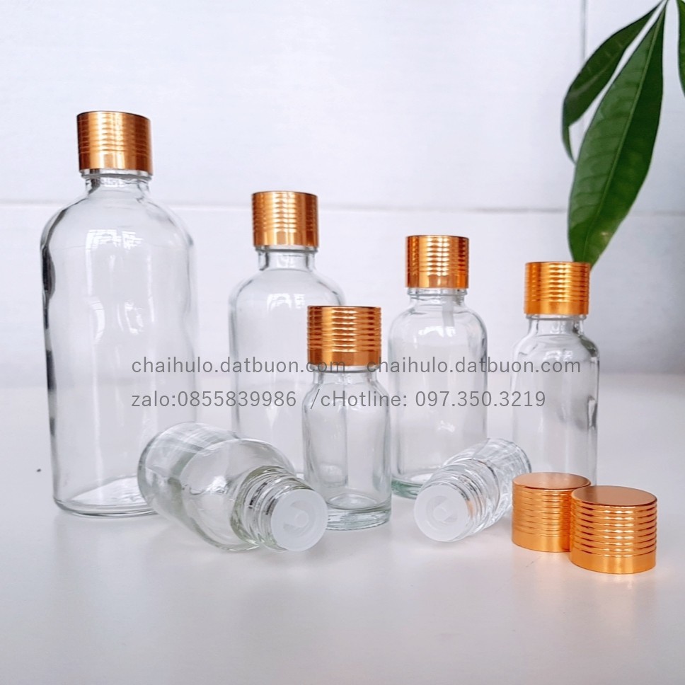 Chai đựng tinh dầu thủy tinh trong suốt với các loại dung tích 50ml nắp màu nhôm vàng• Xuất xứ: Trung Quốc