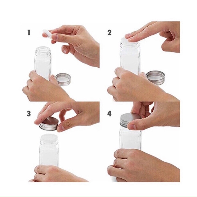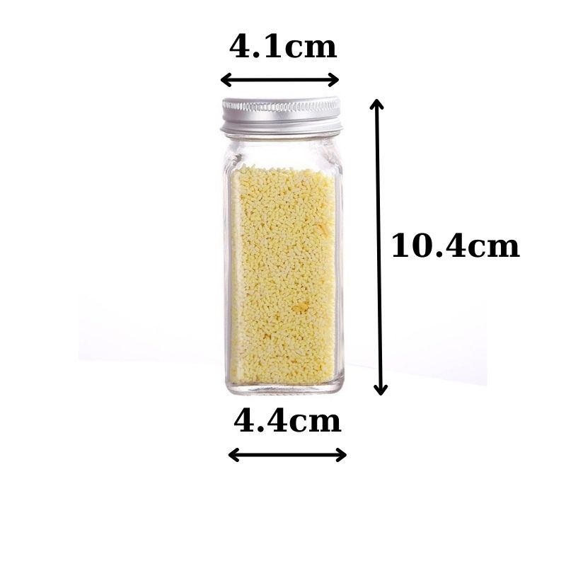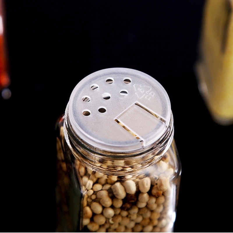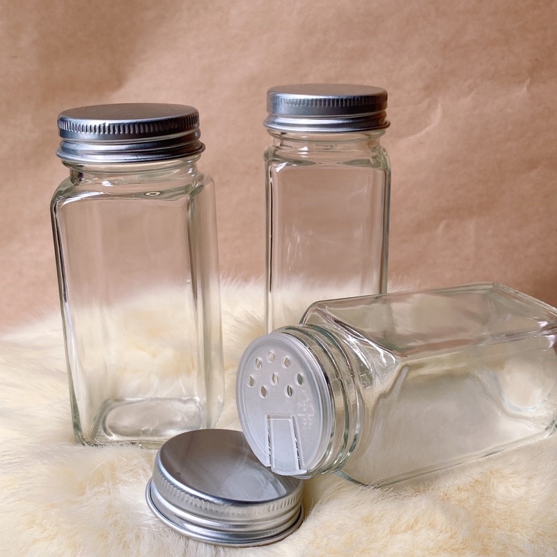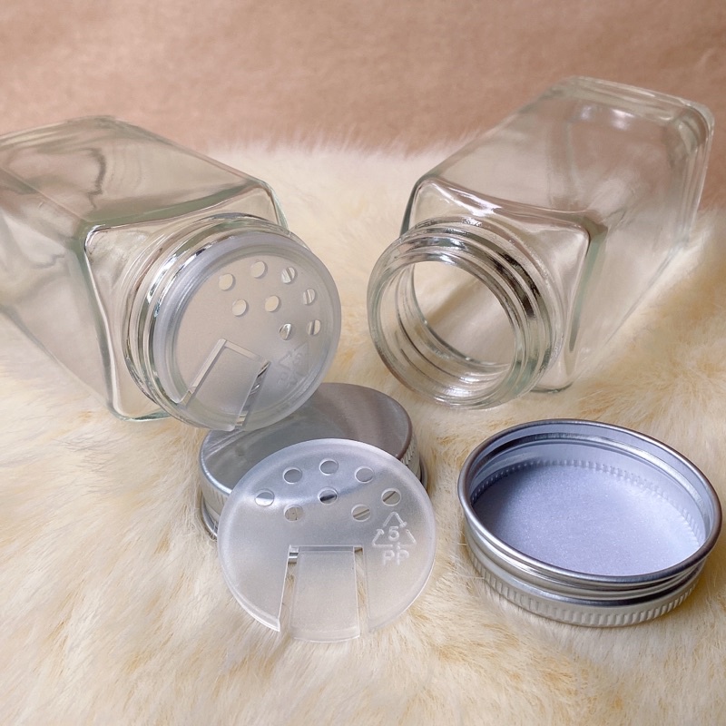 - Chất liệu: Thủy tinh dày trong suốt không chì kèm nắp nhôm và nắp nhựa có lổ nhỏ dễ dàng rắc gia vị khi sử dụng