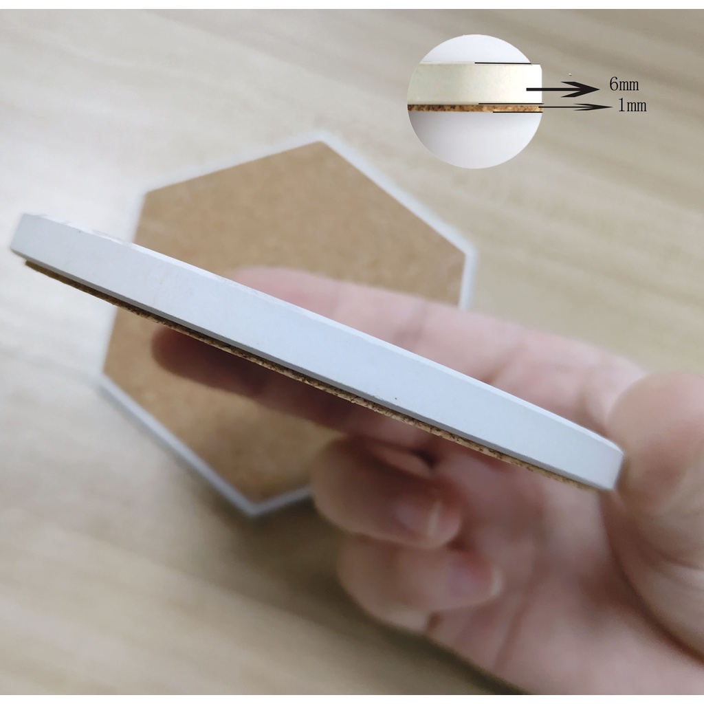 Bộ sản phẩm gồm 6 miếng lót ly, cốc siêu thấm hút sử dụng vật liệu hoa văn gốm Ceramic cao cấp, phía sau có một lớp bần nhám giúp chống trượt