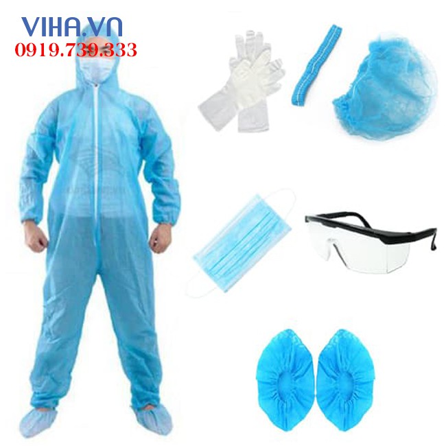 - Bộ 7 món đầy đủ bao gồm: áo quần mũ, khẩu trang, bao giày trùm, găng tay cao su, kính bảo hộ