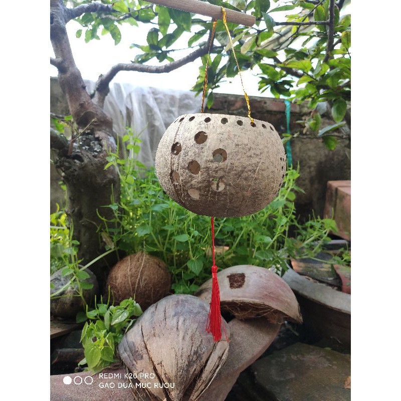 Combo 70 gáo lồng đèn gồm dây treo, dây trang trí, được khoan lỗ viền miệng và dưới đế gáo, họa tiết xung quanh.Giá X
