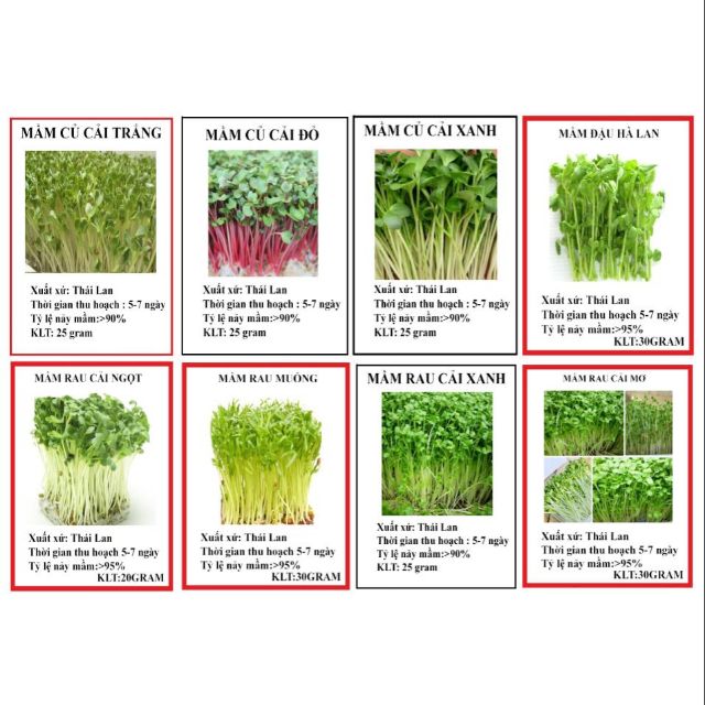 Nhà cửa & Đời sống > Làm vườn > Hạt giống & chất hỗ trợ trồng cây || Combo 8 loại hạt giống rau mầm 8 gói như hình(củ cải trắng, củ cải đỏ, củ cải xanh, đậu hà lan, rau muống, cải ngọt...)Còn hàng