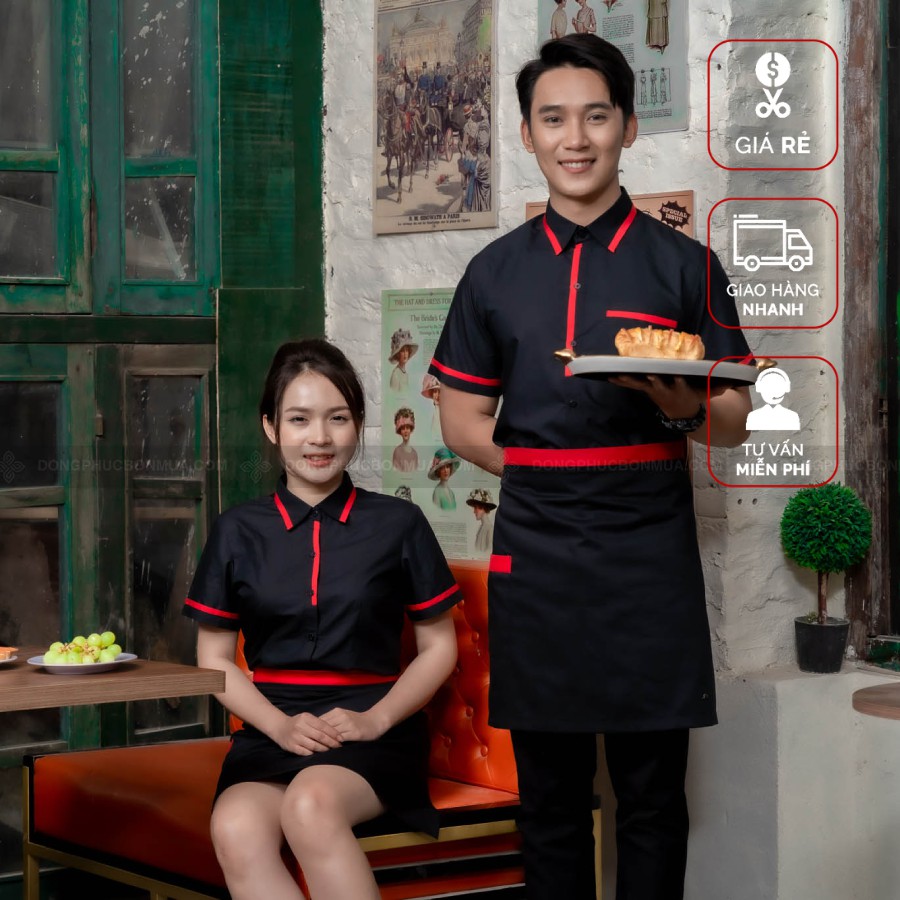Combo Áo Đồng Phục Đen Cổ Phối Kẻ Đỏ Và Tạp Dề Cho Nhà Hàng, Cafe Giá Siêu Rẻ, Thoáng Mát, Co Giãn, Bao Đẹp