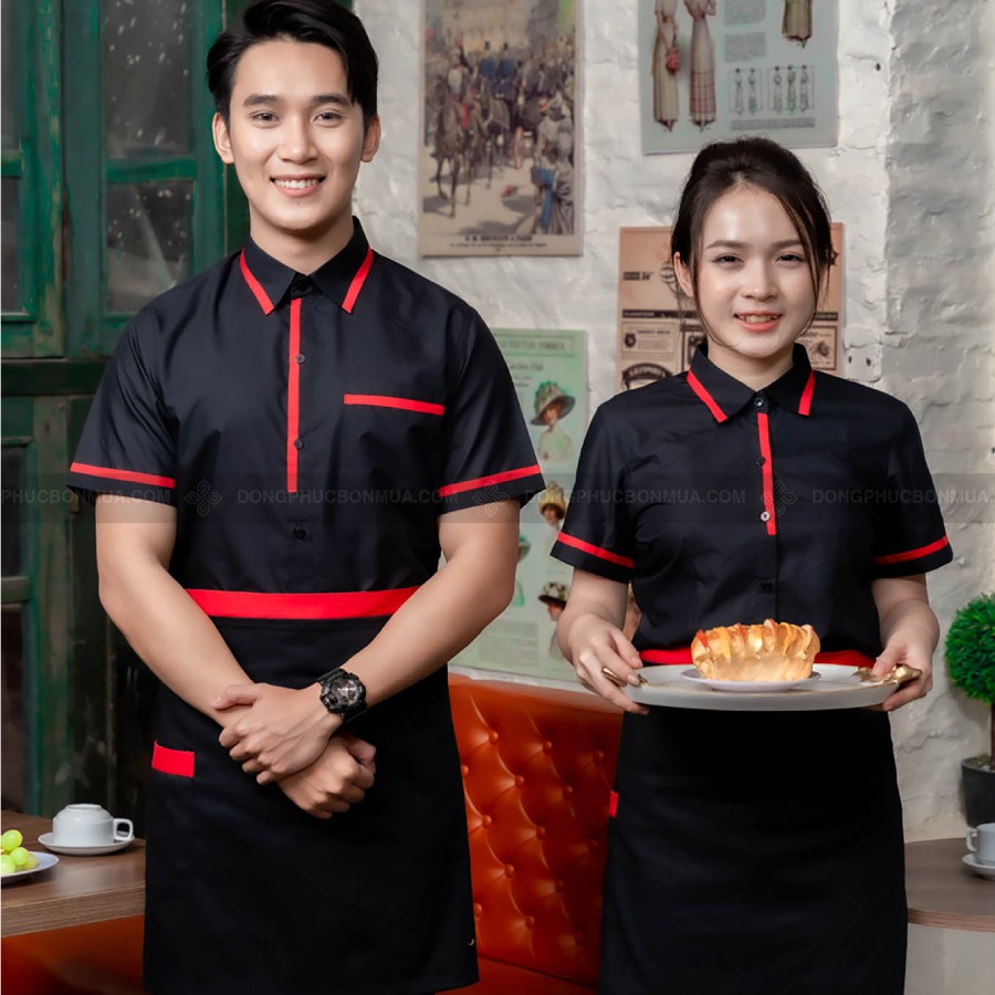 Giới thiệu Combo Áo Đồng Phục Đen Cổ Phối Kẻ Đỏ Và Tạp Dề Cho Nhà Hàng, Cafe Giá Siêu Rẻ, Thoáng Mát, Co Giãn, Bao Đẹp
