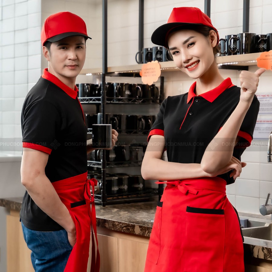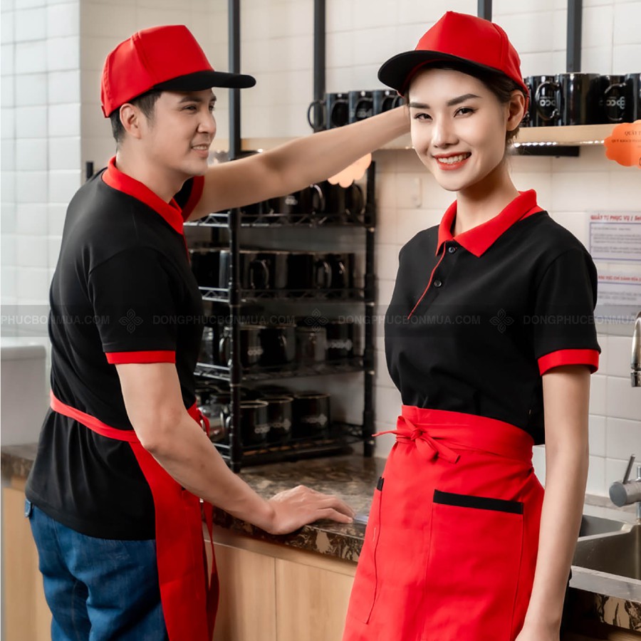 👉Sản phẩm Combo Áo Đồng Phục Đen Phối Cổ Đỏ Và Tạp Dề Nhà Hàng, Quán Cafe Siêu Rẻ, Chất Cotton/ Lacoste từ Đồng Phục Bốn Mùa.