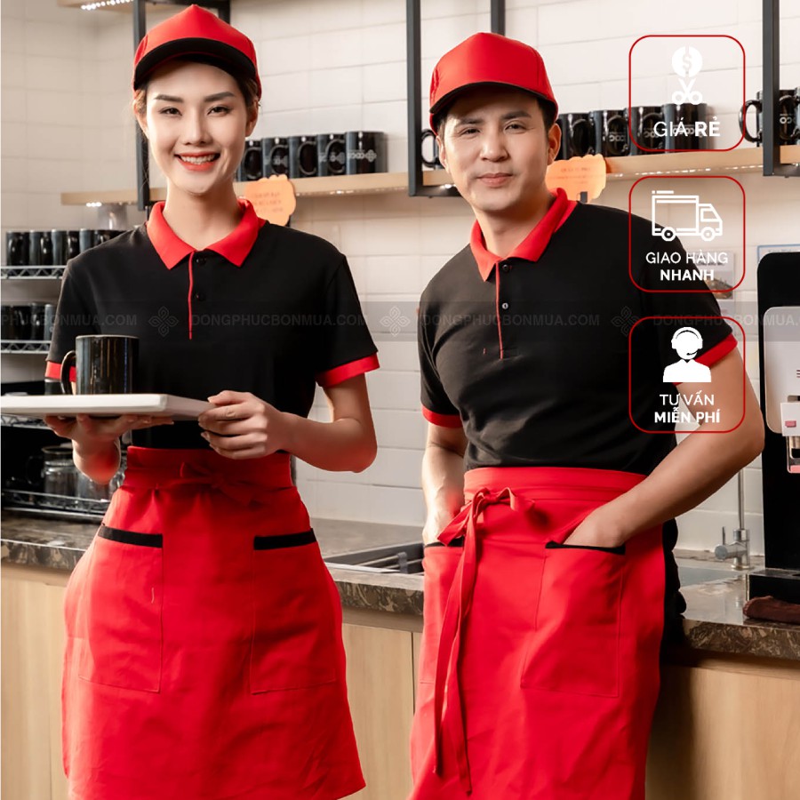 Combo Áo Đồng Phục Đen Phối Cổ Đỏ Và Tạp Dề Cho Nhà Hàng, Cafe Giá Siêu Rẻ, Thoáng Mát, Co Giãn, Bao Đẹp