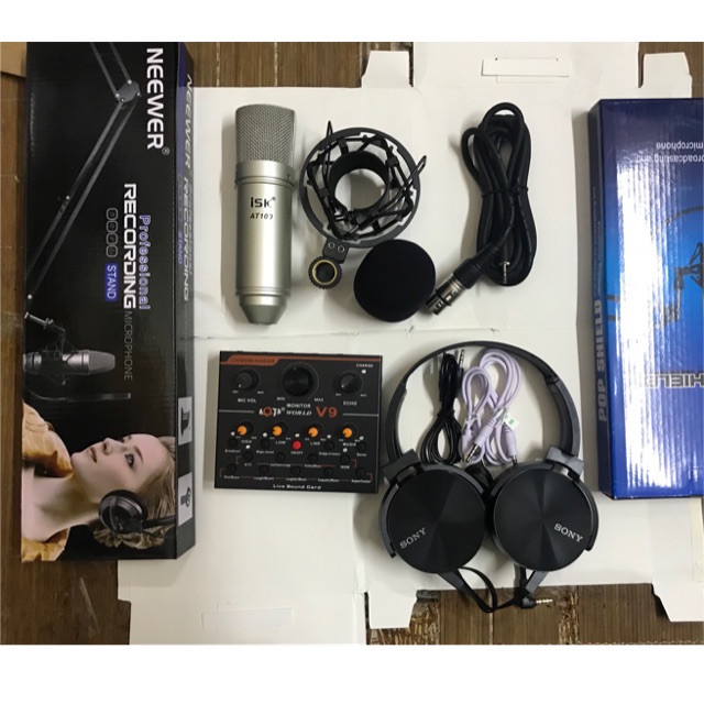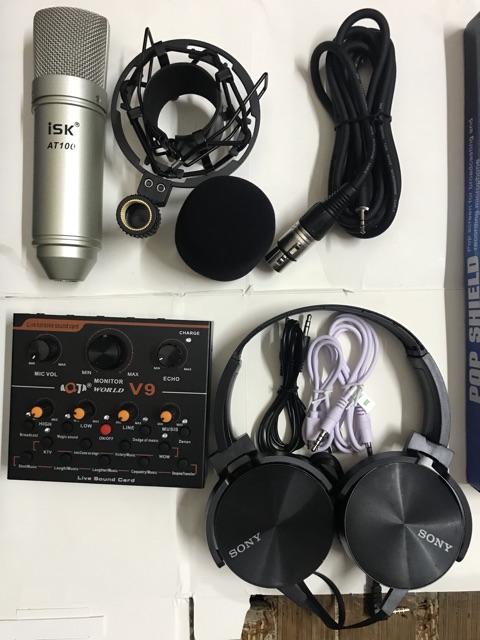 Bộ combo Mic thu âm ISK At100 soundcard v9 quốc tế full phụ kiện tặng tai nghe kiểm âm chụp tai sony- Mic Isk chính hãng AT100 có mã vạch in trên chuôi mic, kèm bệ đỡ bông lọc âm dây 3.5mm tiêu chuẩn
