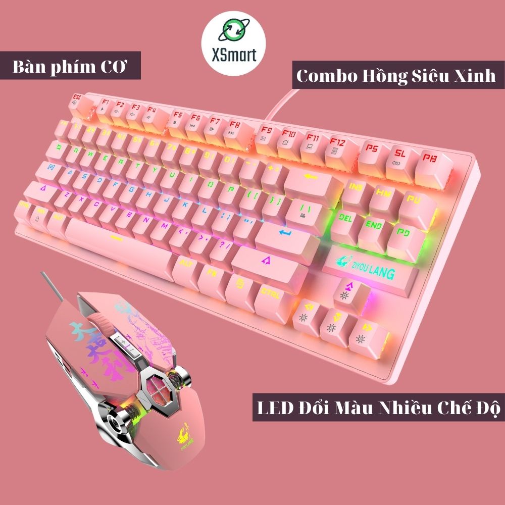Combo bàn phím cơ và chuột full PINK siêu đẹp Led đổi màu nhiều chế độ cho máy tính laptop pc K2+V8 HỒNG