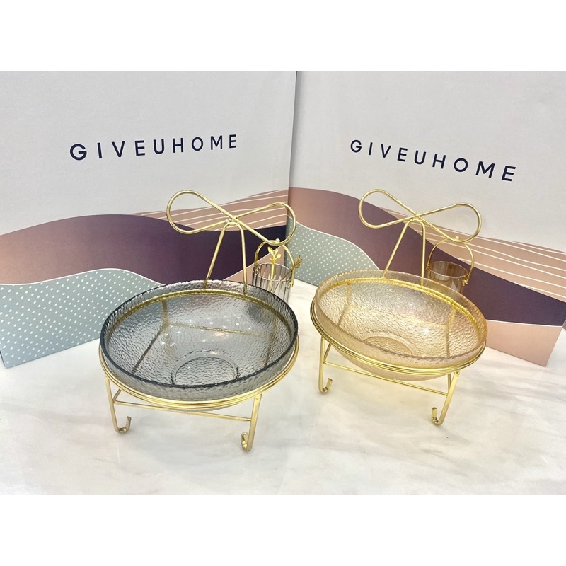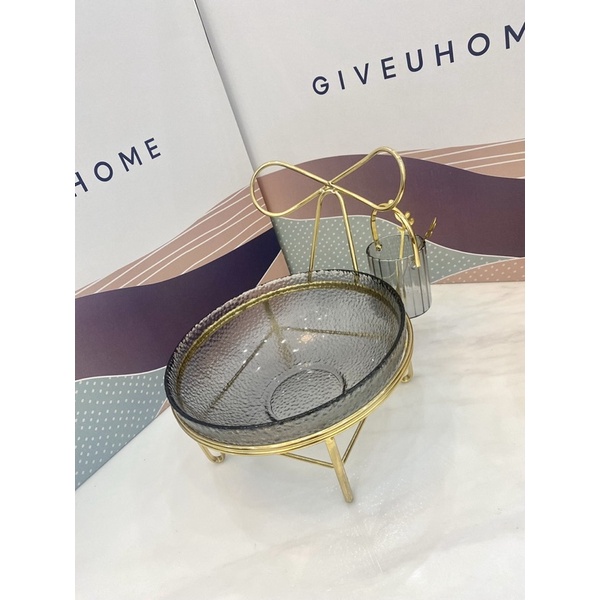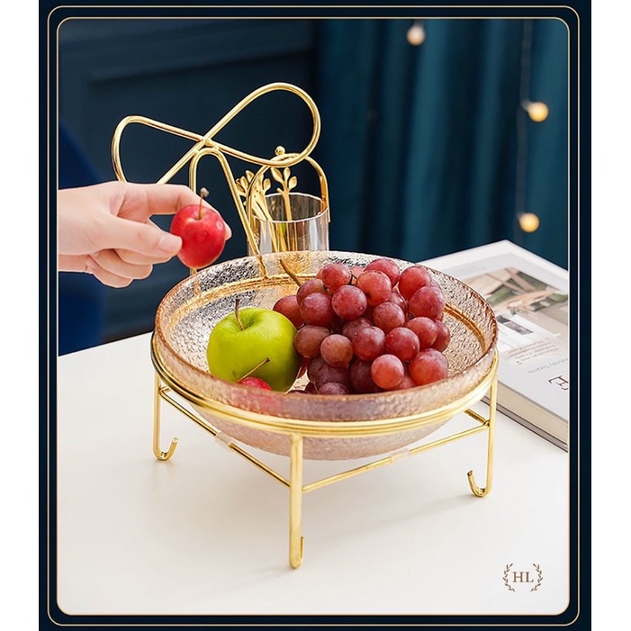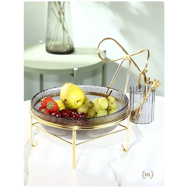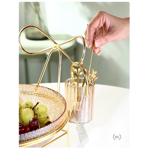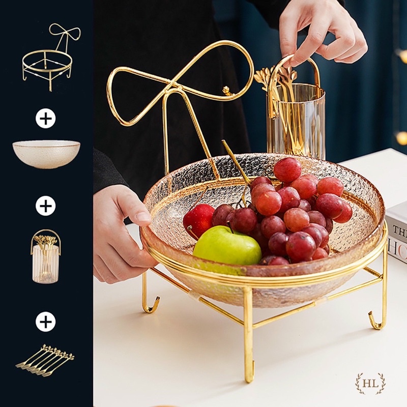Set Lẵng Thủy Tinh Kèm Nĩa + Bát Thủy Tinh Đựng Hoa Quả Kèm Kệ Inox Vàng Màu Hổ Phách - Khói Xám Phong Cách Vintage 2022
