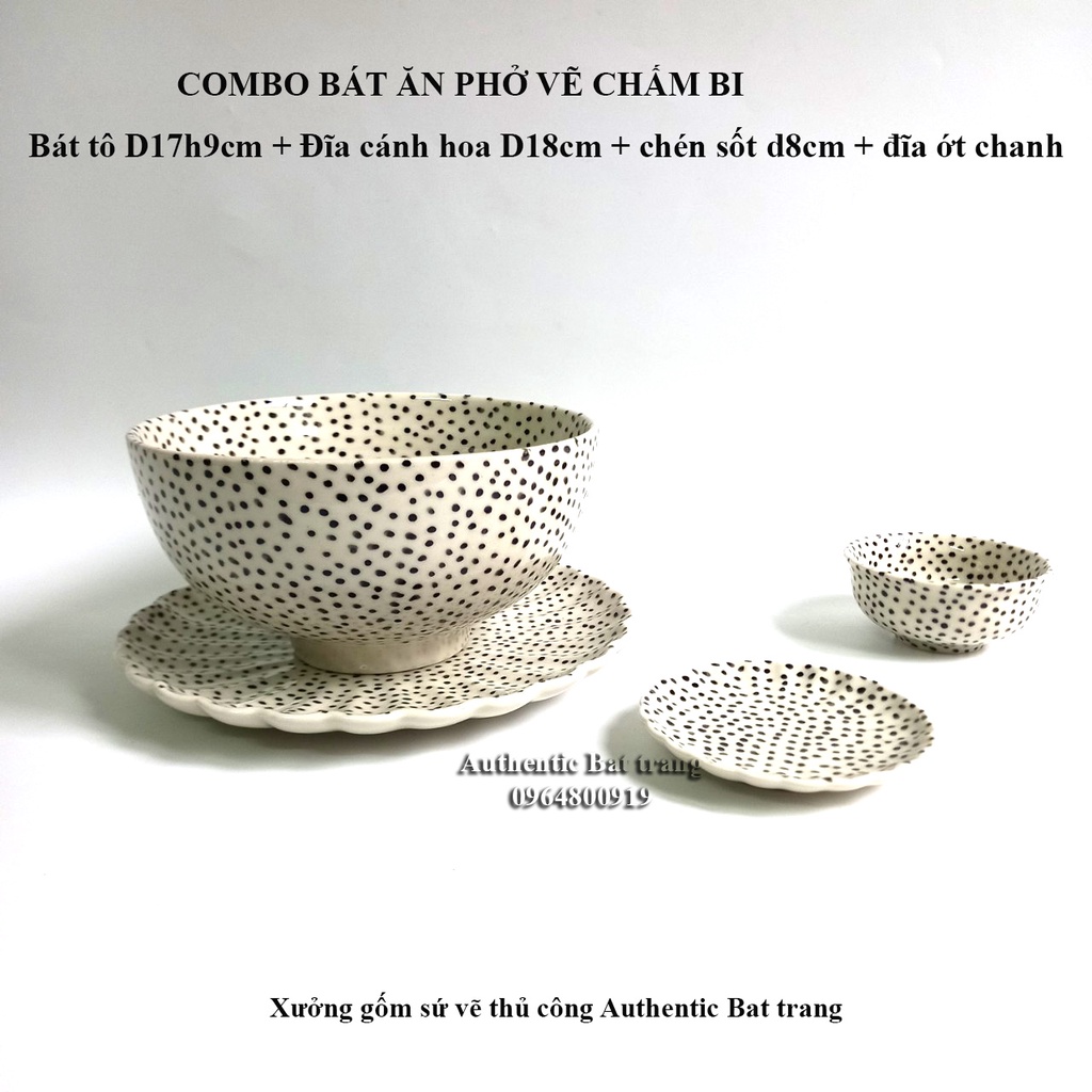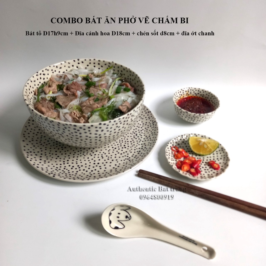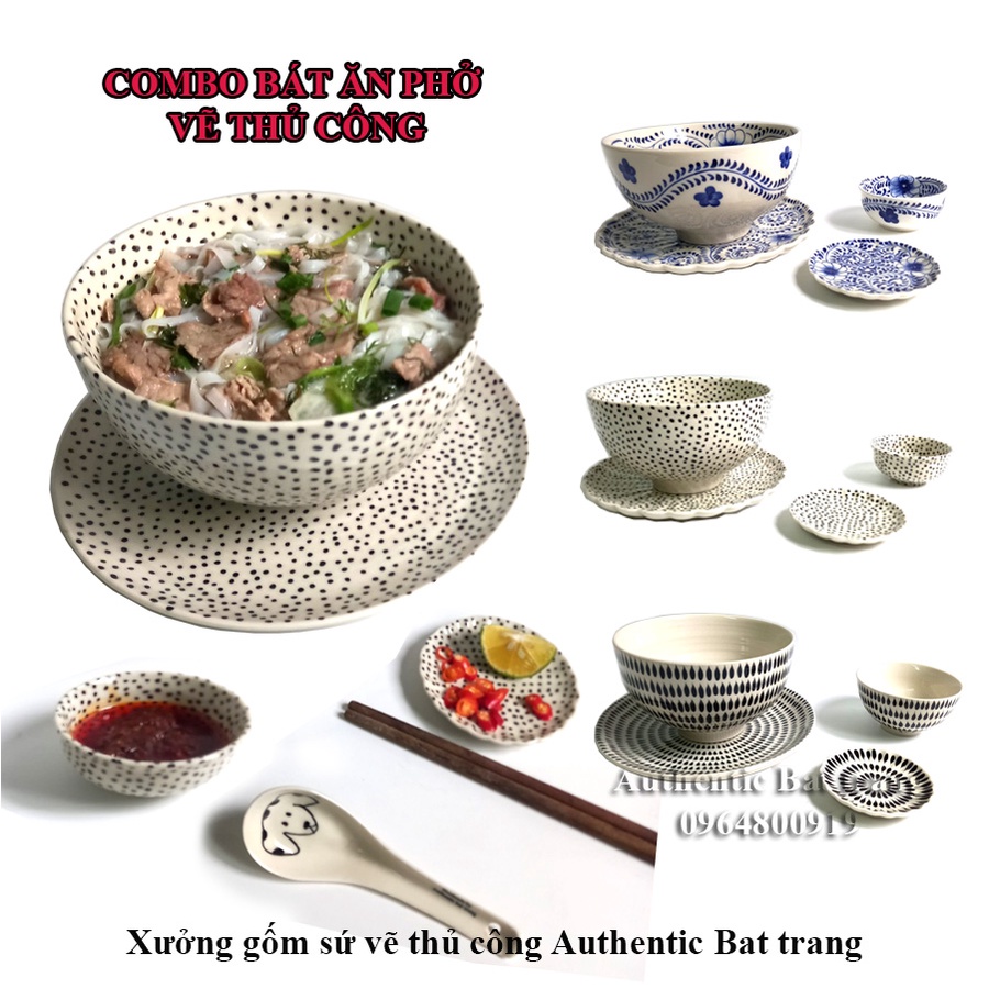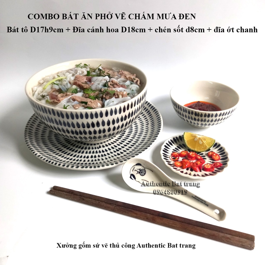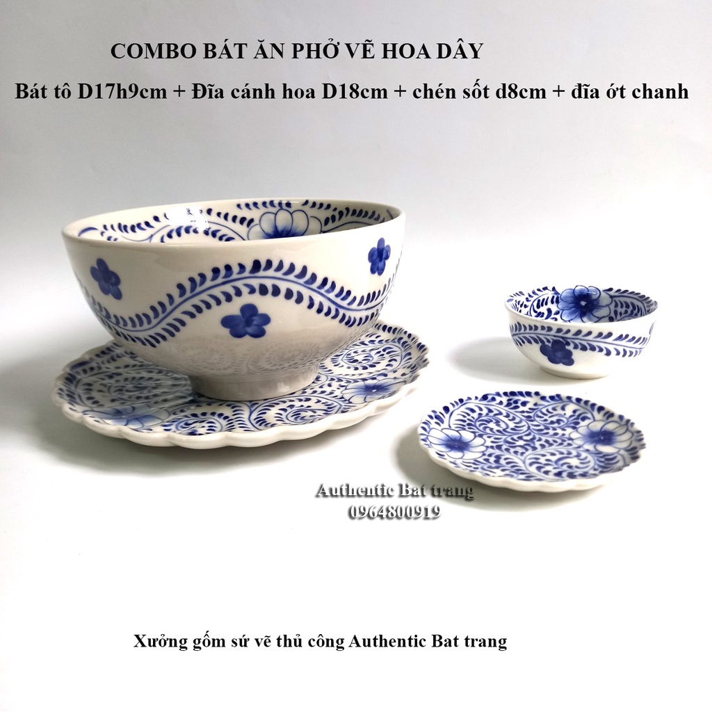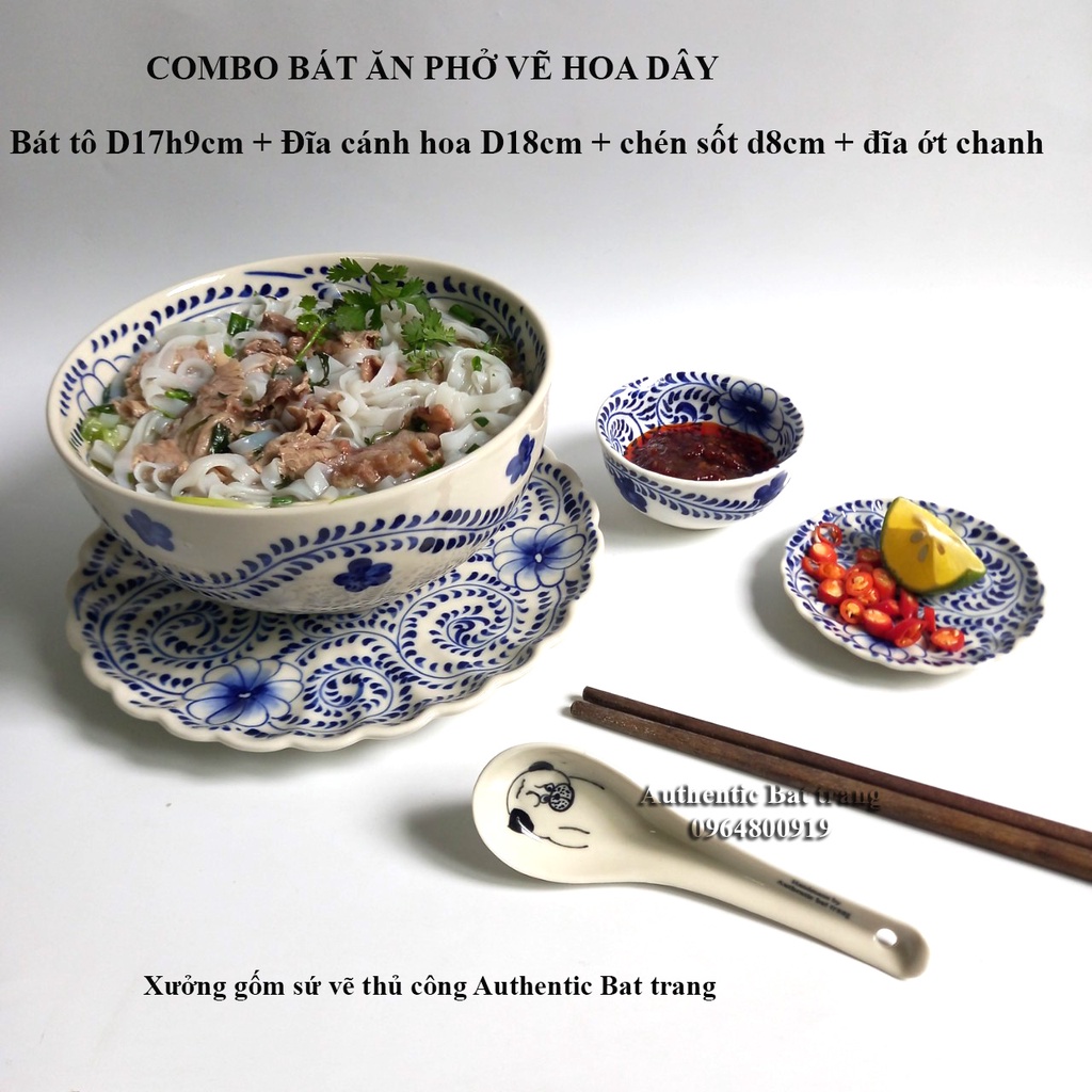 (COMBO) Bát tô sứ ăn phở vẽ tay thủ công - Tô 17H9cm + Dĩa D18cm + chén Sốt D8 + đĩa chanh ớt d9cm Authentic bat trang
