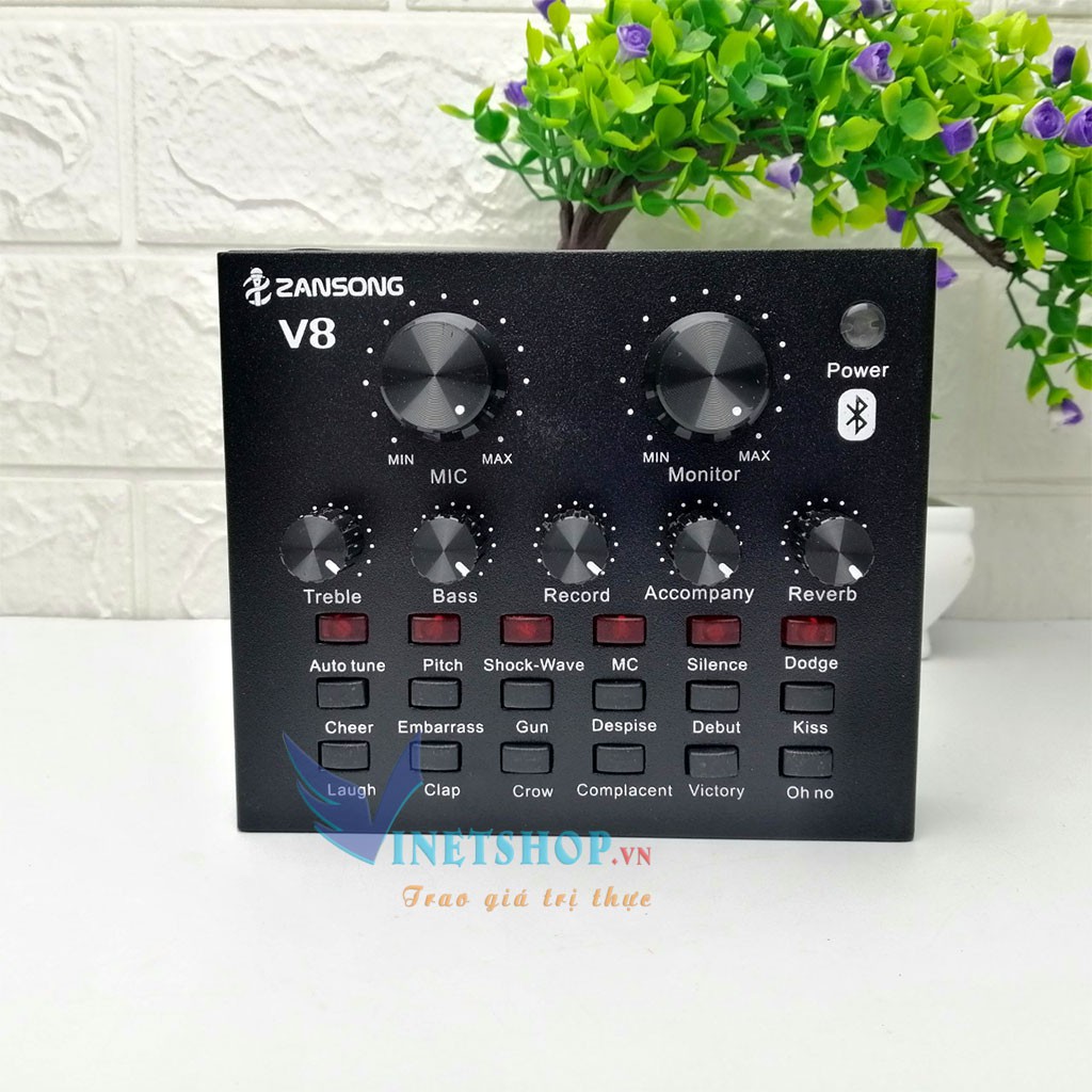 - Sound card thu âm V8 là sản phẩm card âm thanh tương thích với nhiều thiết bị như smartphone, laptop, pc, máy tính bảng. Với tính năng làm méo giọng hát, thành giọng trẻ em, người già, Khả năng chèn các hiệu ứng âm thanh vào các đoạn thu như tiếng vỗ tay, tiếng hò reo, nhạc cổ vũ, tiếng chim kêu... với 12 hiệu ứng âm thanh, sẽ đem lại cho bạn trải nghiệm thu âm vô cùng thú vị.