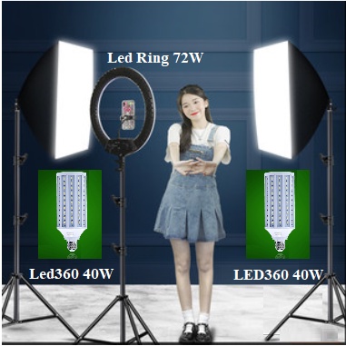 Bộ sản phẩm bao gồm: 3 chân 2m, 2 Softbox 50x70cm, 2 Bóng đèn Led360 40W, 1 đèn HQ21-72W kèm kẹp điện thoại