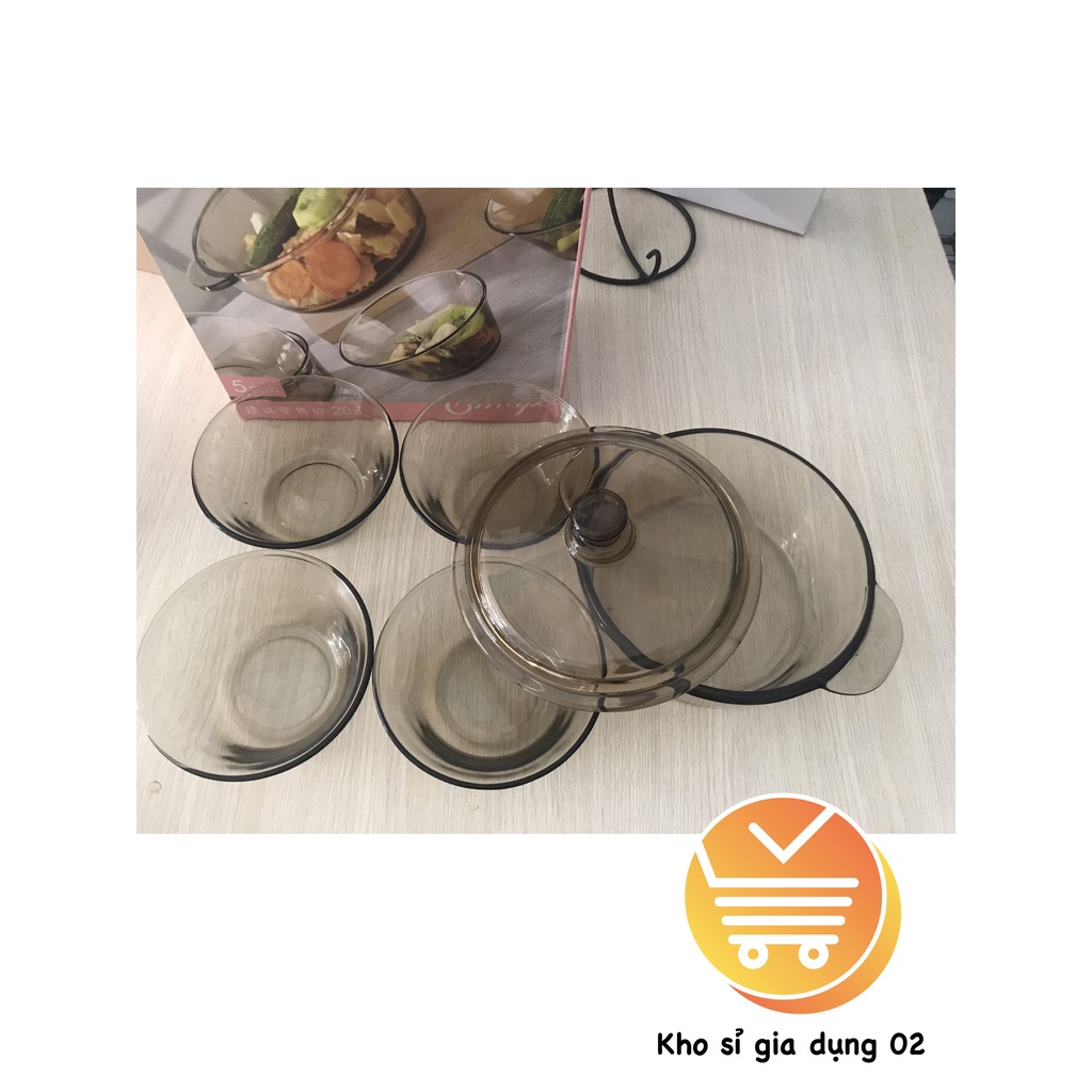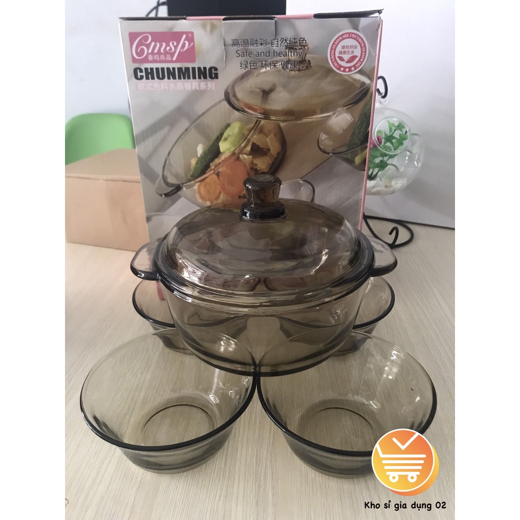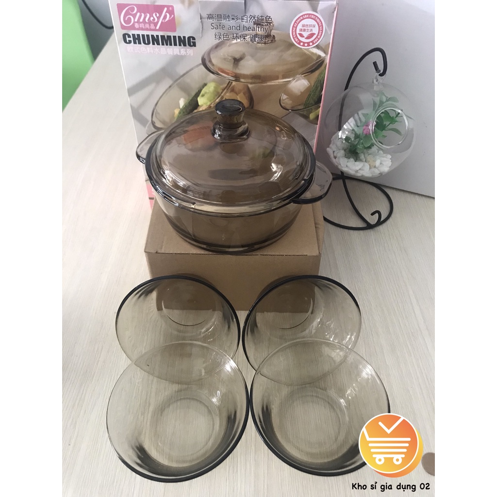 Combo bộ 5 món 1 nồi & 4 bát thuỷ tinh chịu nhiệt T2 cao cấp, xịn sò, Làm quà tặng sang trọng