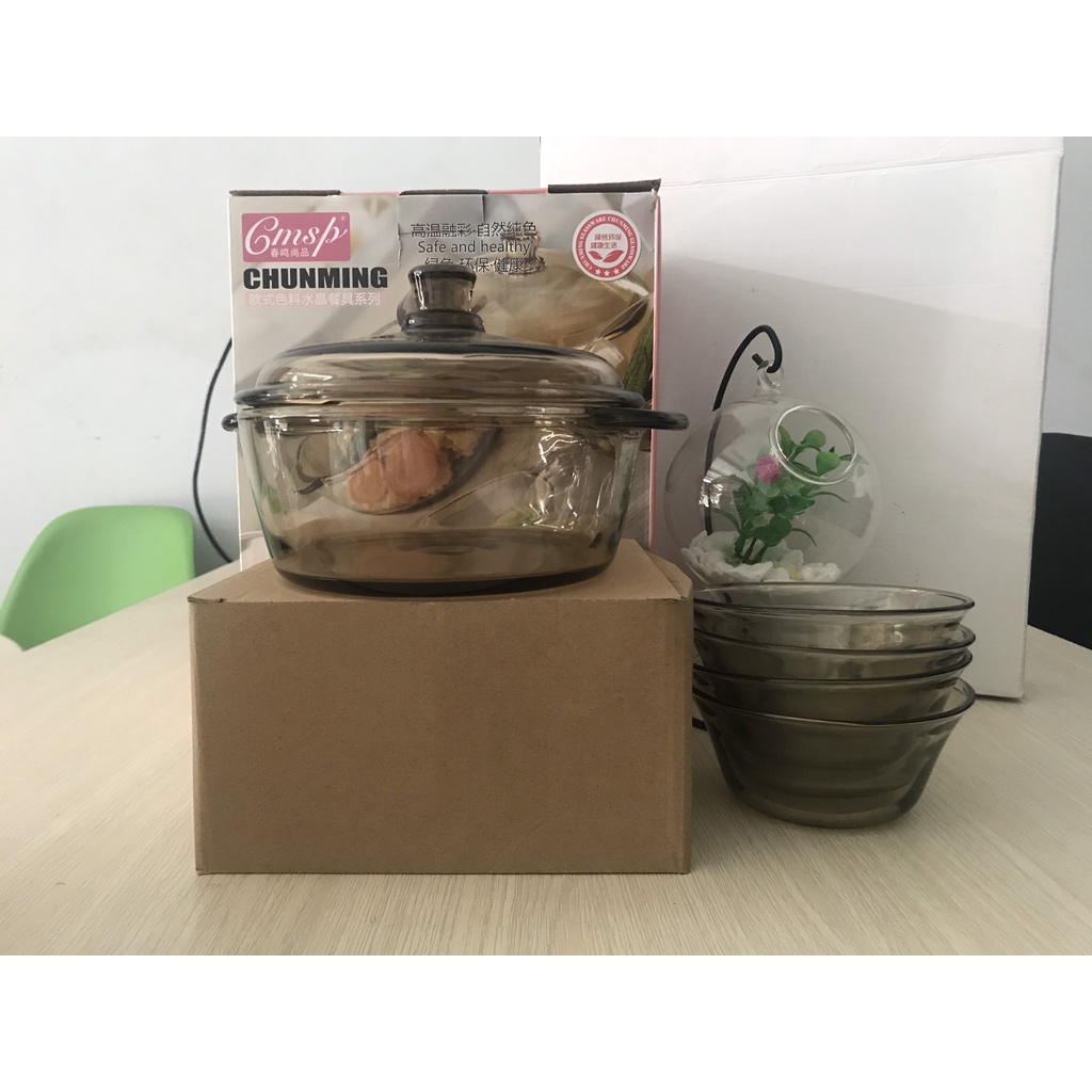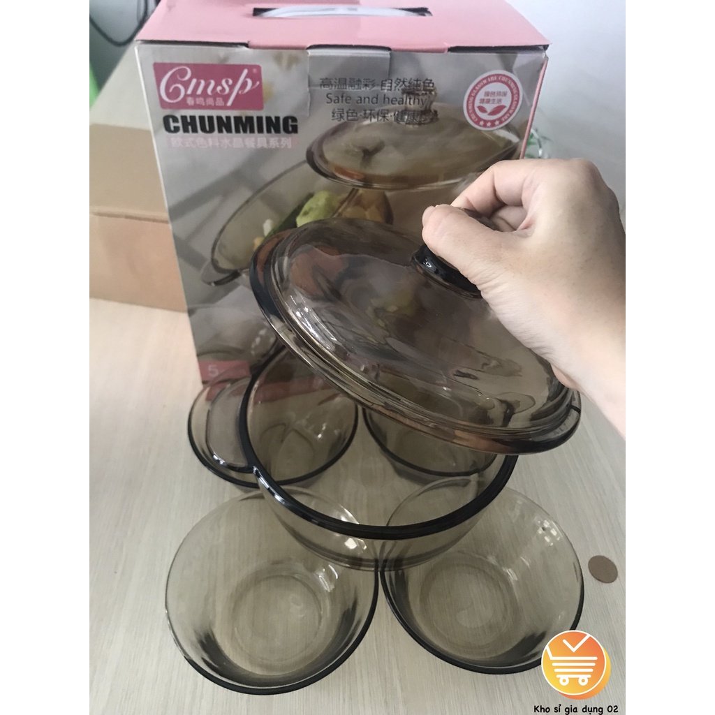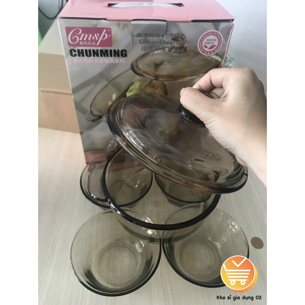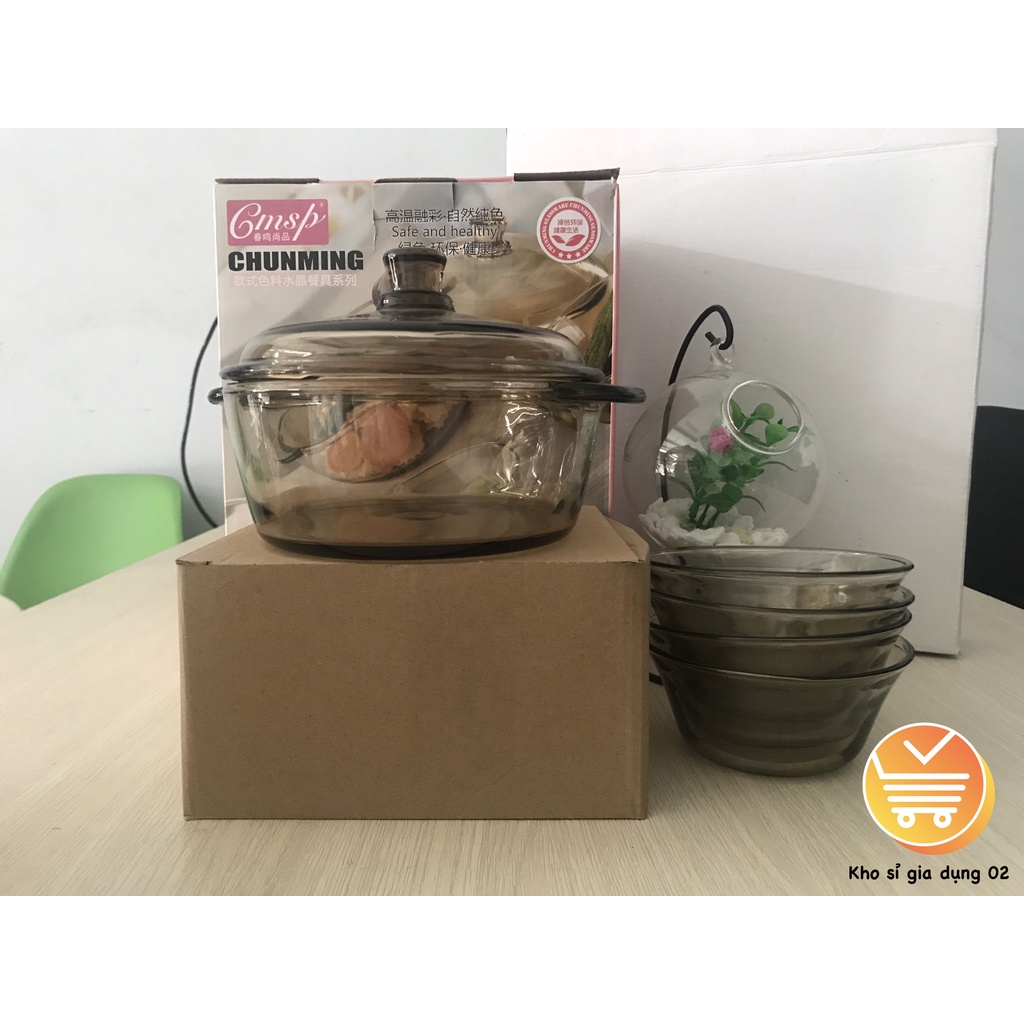 Combo bộ 5 món 1 nồi & 4 bát thuỷ tinh chịu nhiệt T2 cao cấp, xịn sò, Làm quà tặng sang trọng