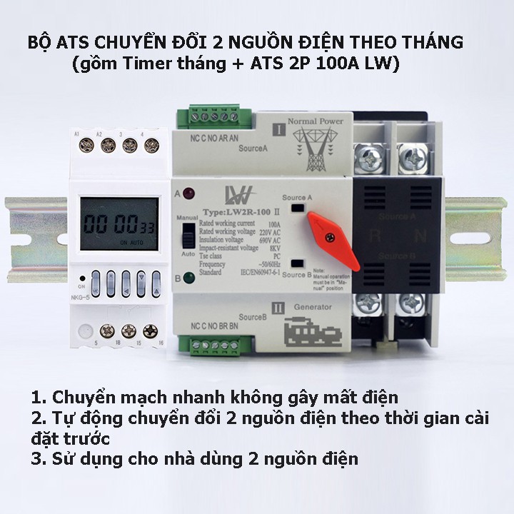 Combo bộ chuyển đổi 2 nguồn điện luân phiên 15 ngày trong tháng tự động không gây mất điện gồm Timer tháng NKG5 + ATS LW 100A:Ứng dụng: