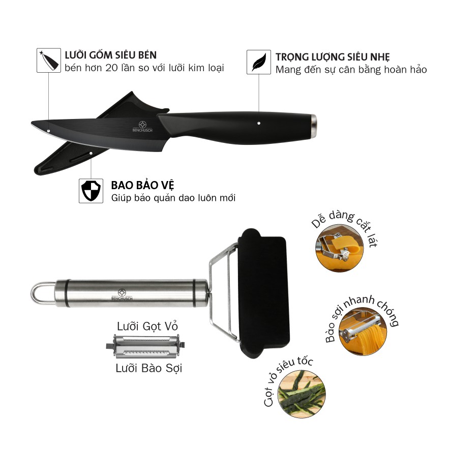 BỘ DỤNG CỤ BÀO GỌT RAU CỦ ĐA NĂNG VÀ DAO GỐM BENCHUSCH