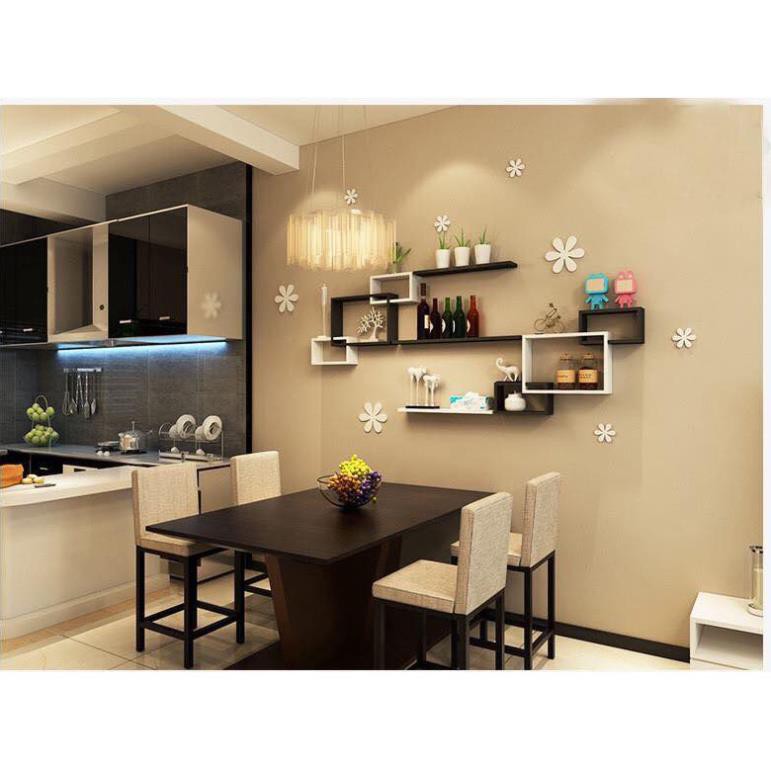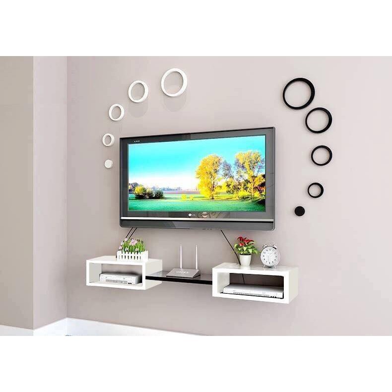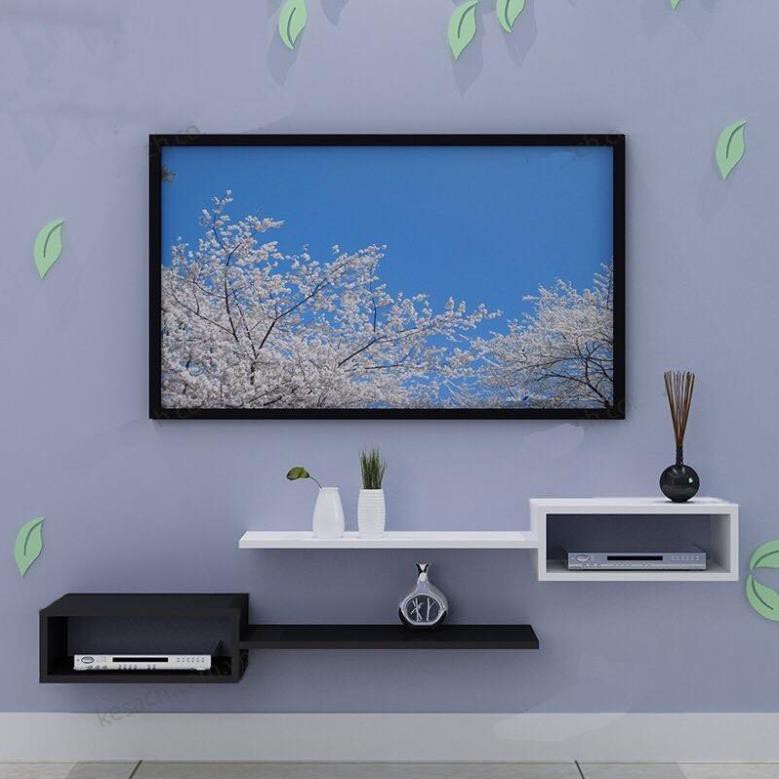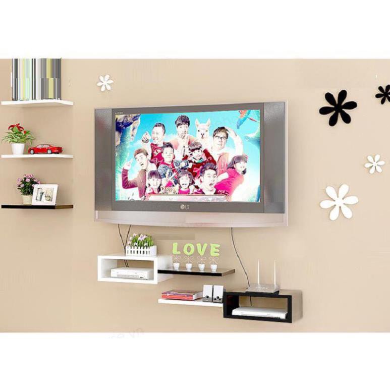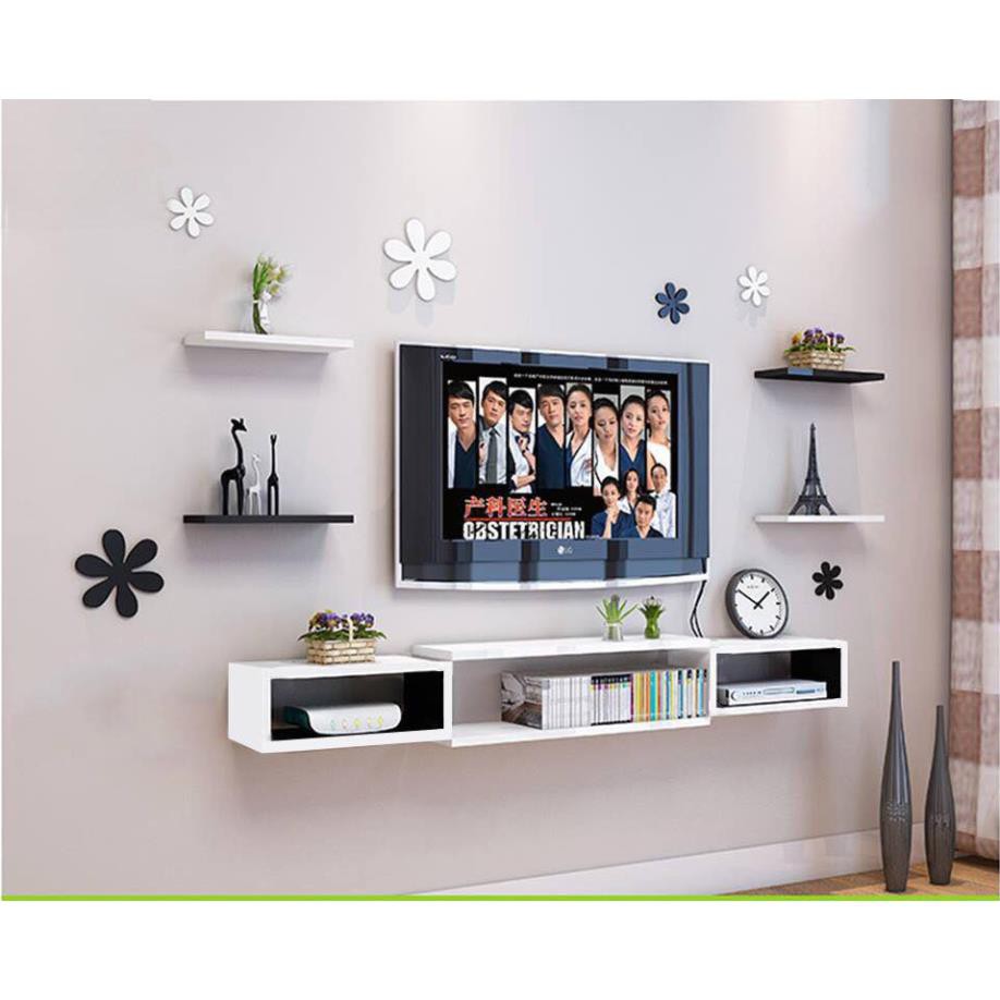 Kệ treo tường: - 3 thanh ngang đen, trắng dài 40cm X sâu 13cm- 2 hộc DVD: Rộng 20cm x sâu 20cm x cao 16cm