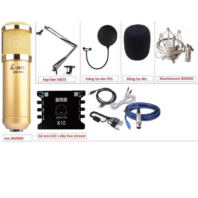 COMBO bộ livetream karaoke AMI BM 900, k10, dây, châm đế, màng lọc tai nghe j5