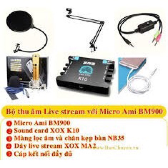 Thiết Bị Âm Thanh > Micro thu âm || COMBO bộ livetream karaoke AMI BM 900, k10, dây, châm đế, màng lọc tai nghe j5Còn hàng