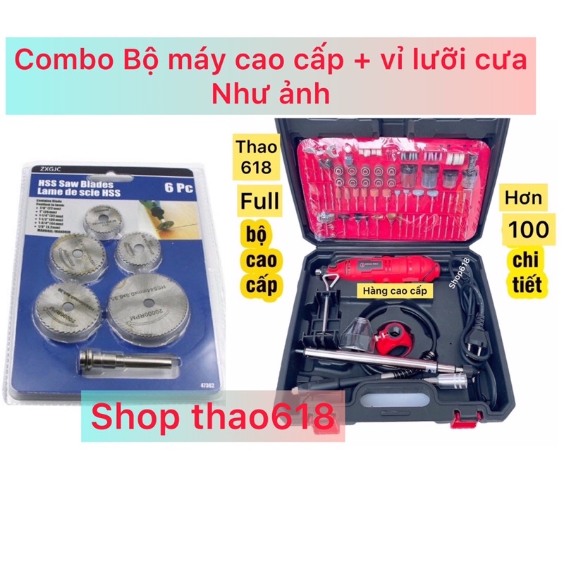 Bộ phụ kiện đầy đủ :máy mài, nhám, đánh bóng, đầu kẹp, khắc, khoan,...