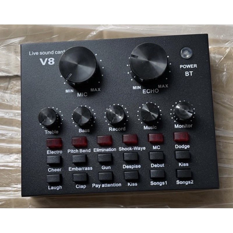 Với tính năng làm méo giọng hát, thành giọng trẻ em, người già, Khả năng chèn các hiệu ứng âm thanh vào các đoạn thu như tiếng vỗ tay, tiếng hò reo, nhạc cổ vũ, tiếng chim kêu... với 12 hiệu ứng âm thanh, sẽ đem lại cho bạn trải nghiệm thu âm vô cùng thú vị. Thông số kỹ thuật của Sound card thu âm V8 Số kênh: 2in/2out Tần số microphone: -42db +/- 1db SNR: >105dB(đầu ra) – >88db(đầu vào) Dynamic Range: > 104db 20Hz-20kHz Tần số đáp ứng: 0 + / -0.3db, 20Hz – 20kHz Nguồn điện: 5v-0.5A Công suất: 4.0w Nhiệt độ hoạt động: 0-50*C Độ ẩm cho phép: