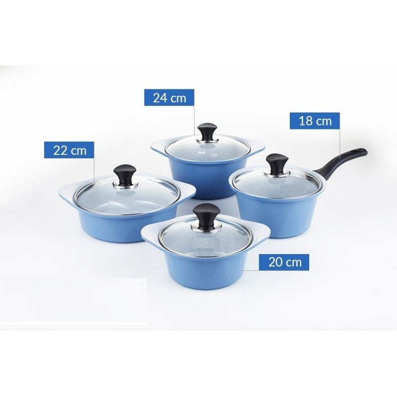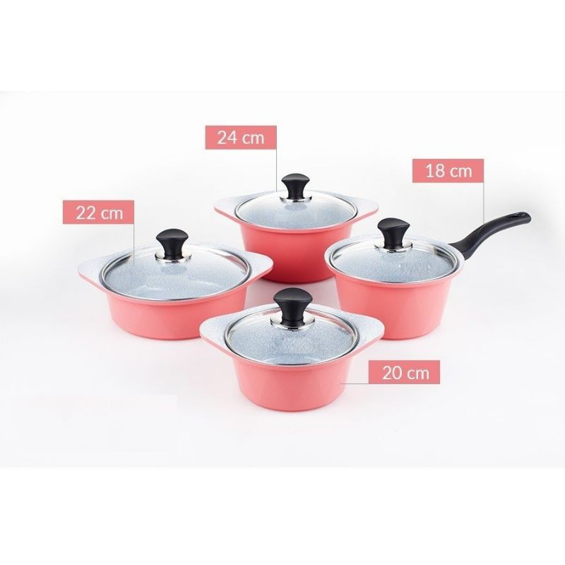 Trọn bộ sản phẩm gồm: 1 quánh 18cm + nắp kính , 3 nồi + nắp kính (20cm - 22cm - 24cm)