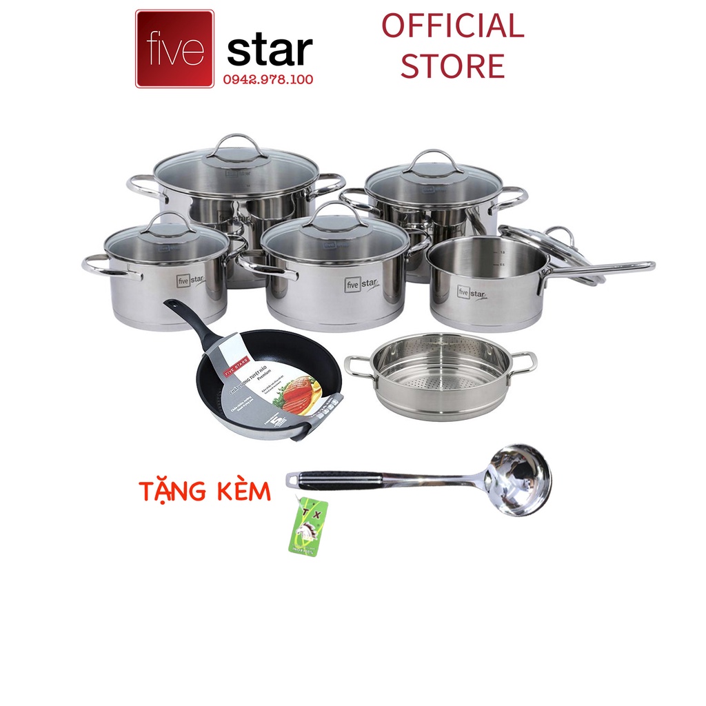 Combo bộ nồi inox 304 và xửng chảo chống dính 3 đáy cao cấp FIVESTAR 7 món nắp kính , tặng 1 vá canh inox