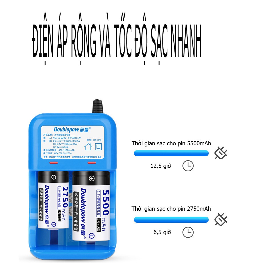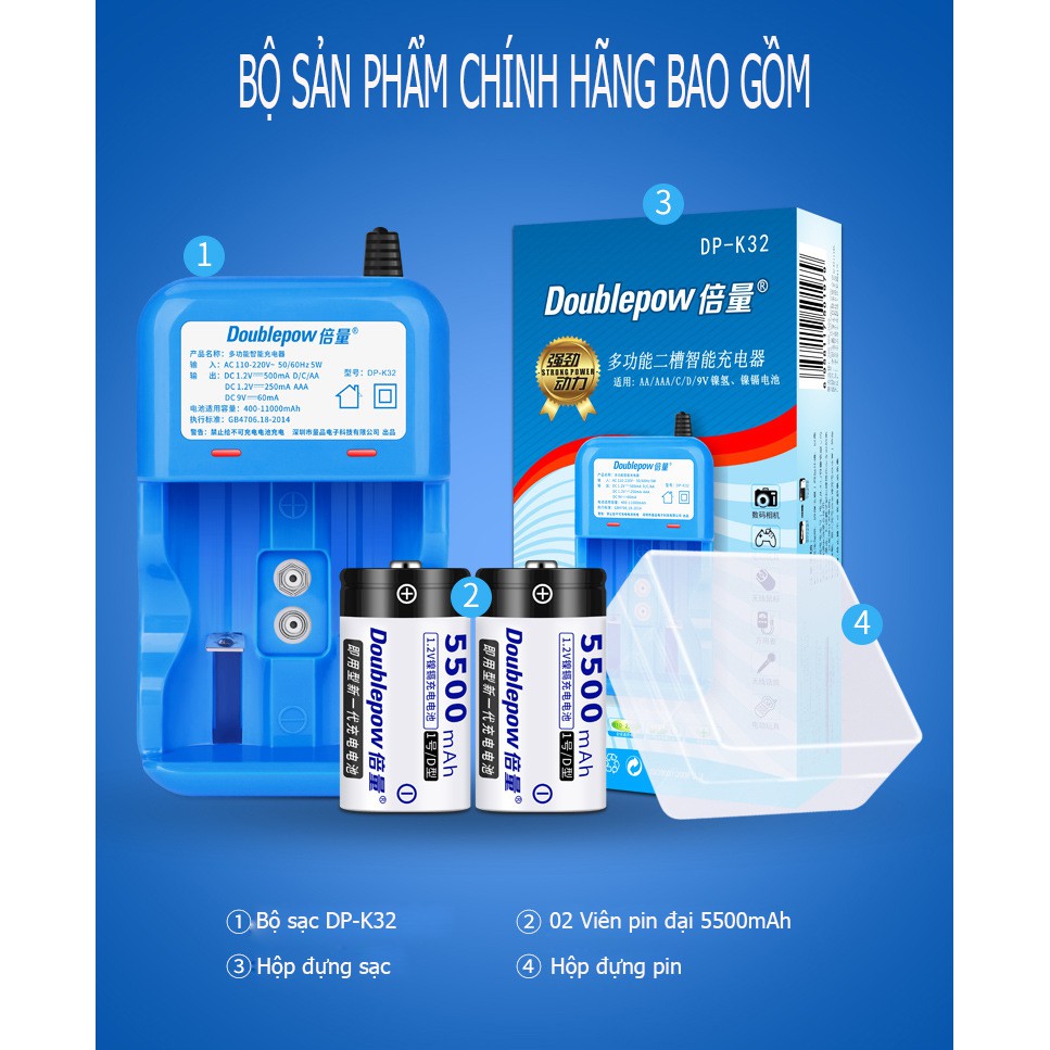 Thiết Bị Điện Gia Dụng > Pin || Combo Bộ sạc pin DP-K32 AA/AAA/C/D đa năng thông minh tự ngắt và 02 viên pin đại (size D) 5500mAh chính hãng DoublepowCòn hàng