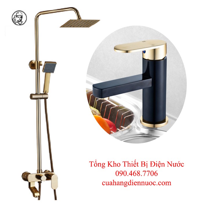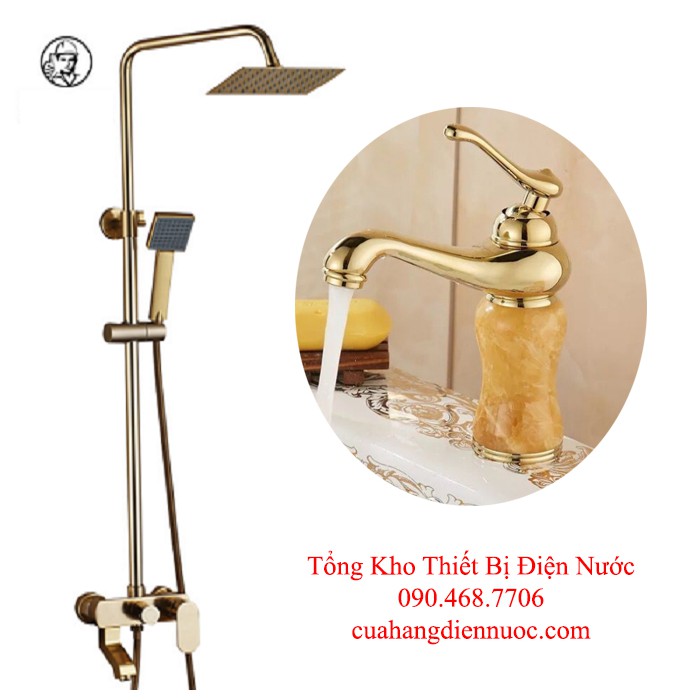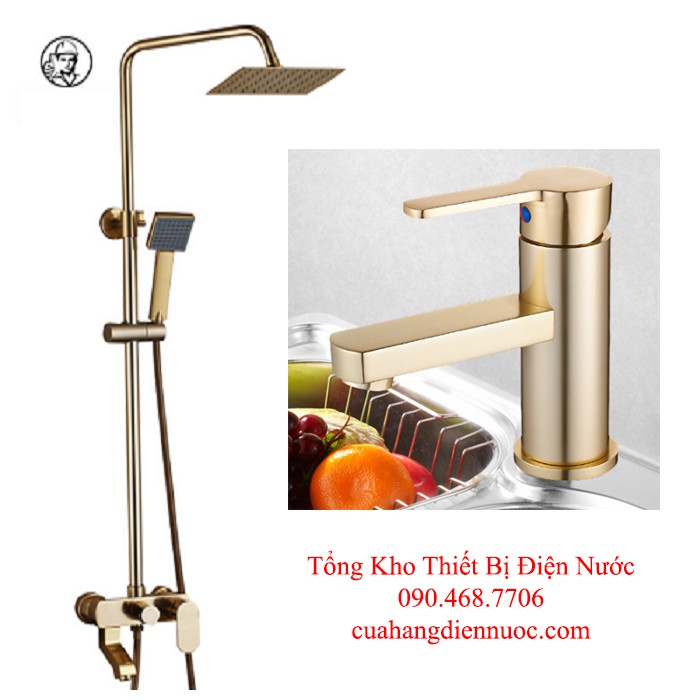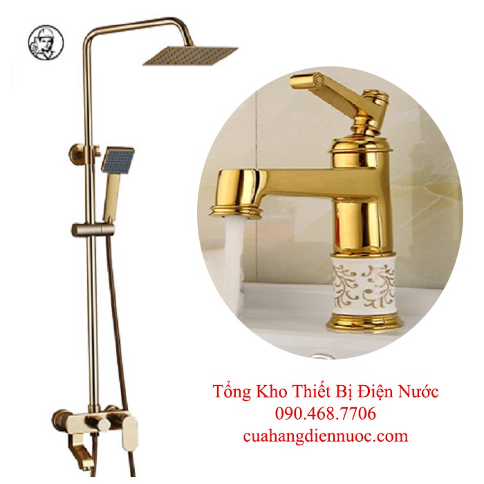 Combo bộ sen cây vàng ánh kim kèm vòi chậu lavabo đính đá cao cấp