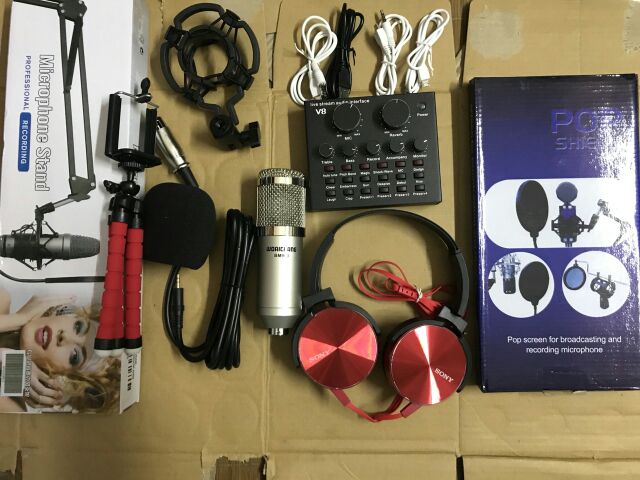 2/gồm bm800 mic v8 và tai nghe kiểm âm chụp tai Sony kèm đủ dây sạc dây lấy nhạc đây live chân kẹp lọc âm 860k
