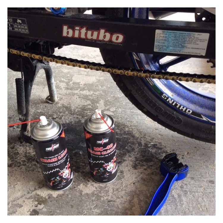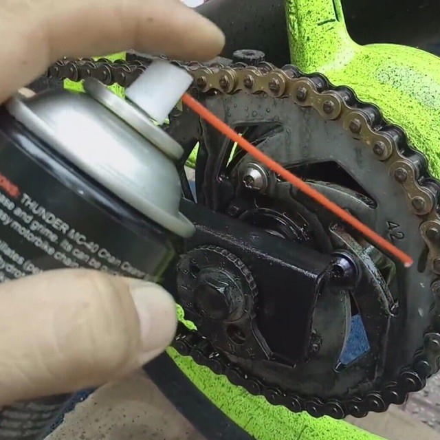 - Lắc đều chai dưỡng Thunder Chain Lube, sau đó xịt trực tiếp lên bề mặt trong của sên. Khi dùng chai xịt sên bạn cần xịt đều lên xích môt lớp mỏng và nhớ xoay vòng sên để bảo đảm mọi bề mặt sên đều được phủ.