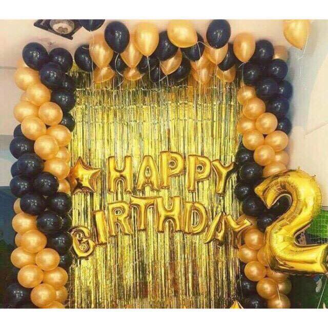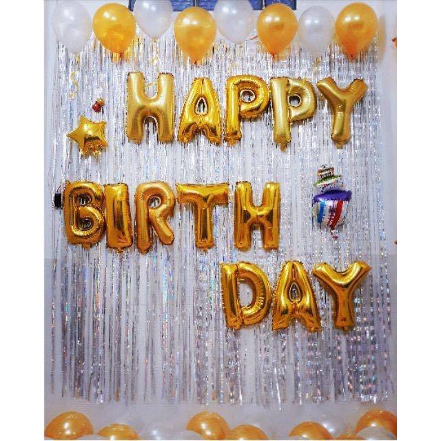 Combo đủ bộ: Chữ happy birthday + rèm kim tuyến+ bơm + băng keo + bóng nhũ....