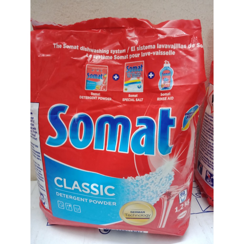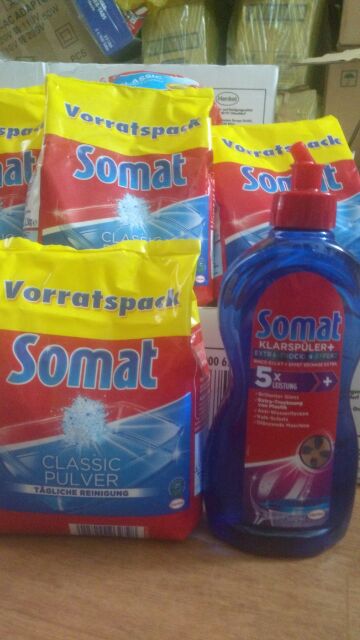 Bột Rửa bát chuyên dụng dành cho máy rửa bát SOMAT (mới ). Sản phẩm được nhập khẩu nguyên hộp từ Đức dùng chuyên dụng cho máy rửa bát.Khi sử dụng bật nắp khay đựng bột rửa của máy rửa bát, dùng thìa đổ khoảng 10 gam tới 20 gam bột rửa chuyên dụng tùy theo lượng bát đĩa cần rửa rồi đóng nắp khay đựng bột rửa lại trước khi vận hành máy. Đối với những loại máy không có khay đựng bột rửa có thể đổ hỗn hợp bột rửa bát chuyên dụng vào đáy máy