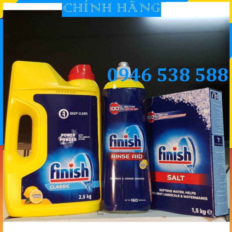 Combo: Bột Finish 2.5kg + Muối Finish 1.5kg + Nước làm bóng Finish 800ml taọ thành bộ sản phẩm đầy đủ tất cả các chức năng dùng cho máy rửa bát chén.- đây Là combo chất tẩy rửa hoàn hảo và tiết kiệm cho Máy rửa bát chén, sản phẩm được sản xuất tại Đức và Liên minh Châu Âu.