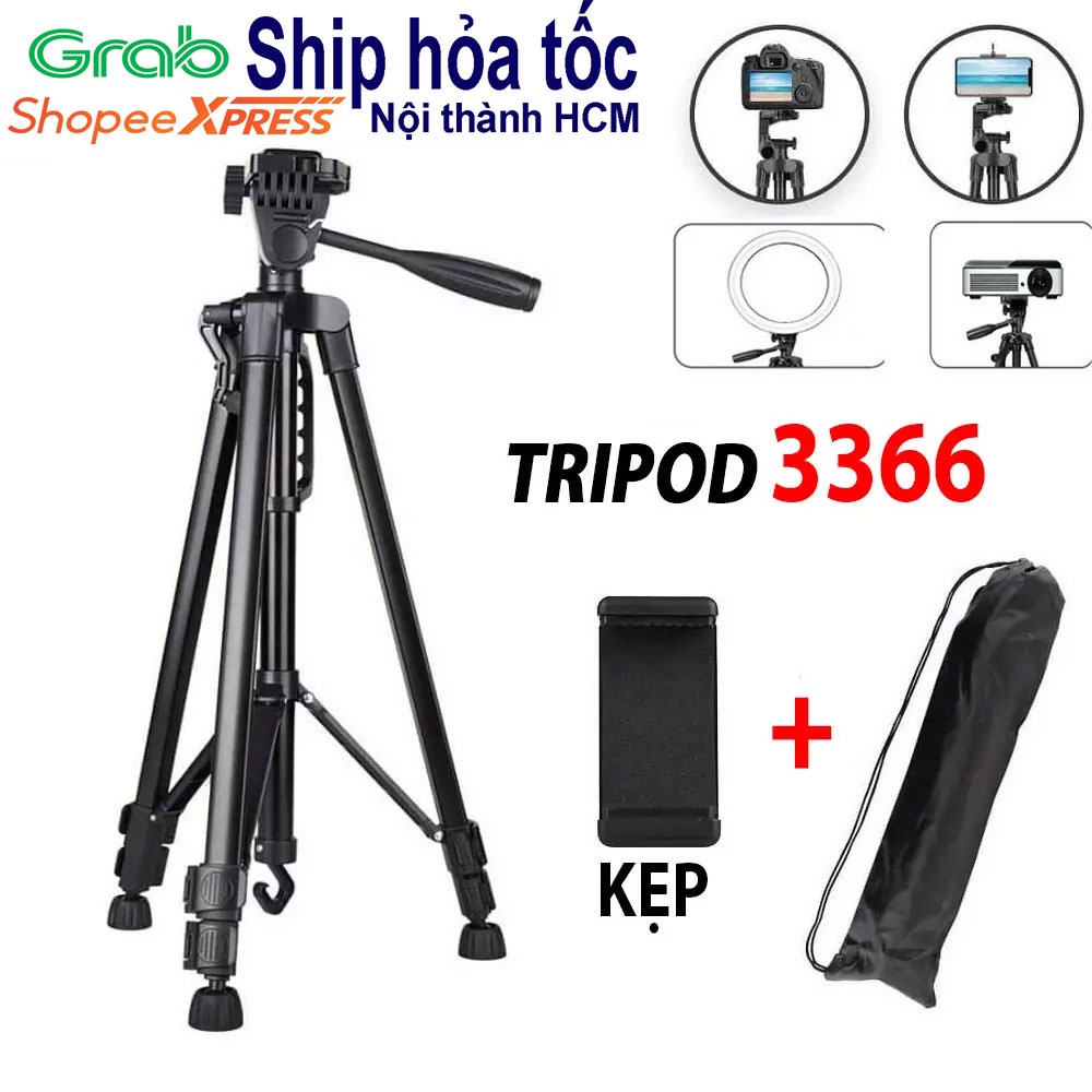 Chân giá đỡ máy ảnh Tripod 3366 có chiều cao 150cm, thiết kế cứng cáp, tripod 3366 là phụ kiện hỗ trợ quay phim, chụp ảnh chuyên nghiệp, có tích hợp tay cầm hỗ trợ quay video rất tiện lợi, phù hợp quay review, livestream, Vlog, Youtuber..
