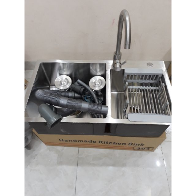 Chậu inox và phụ kiện đi kèm: rổ co giãn + bộ xả xiphong, 2 hố đựng rác, 2 lắp đạy