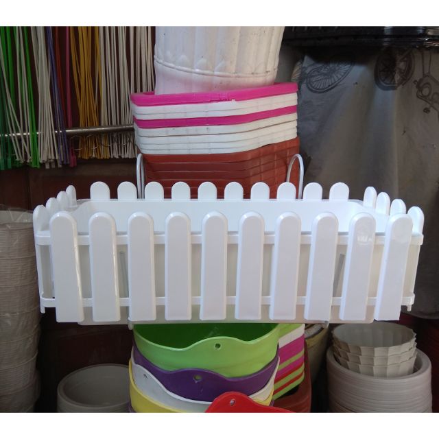 Kích thước Chậu nhựa hàng rào (dài x rộng x cao) : 45x19x15cm, đầu viền hàng rào tròn.Giá sắt treo chậu nhựa hàng rào size Chậu to 45x19x15cm, dạng móc vào lan can ban công, sơn trắng chống gỉ, chắc chắn, độ bền cao.