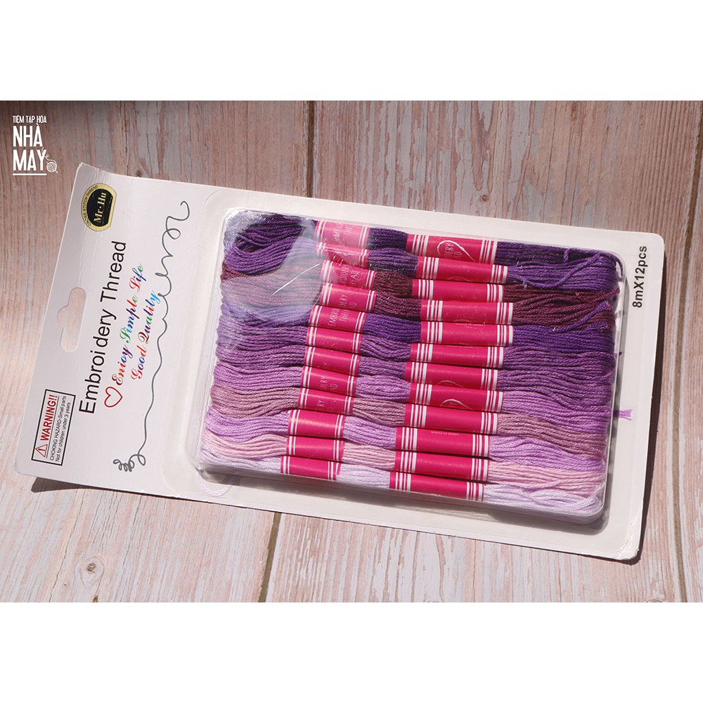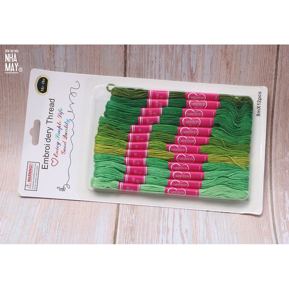 GIẢM 30% SO VỚI MUA LẺ TỪNG MÀU.Chỉ thêu chất lượng trung bình hãng Mr.Hu gồm 12 tép chỉ theo từng tông màu, thuận tiện trong việc phối màu cho các bức thêu.